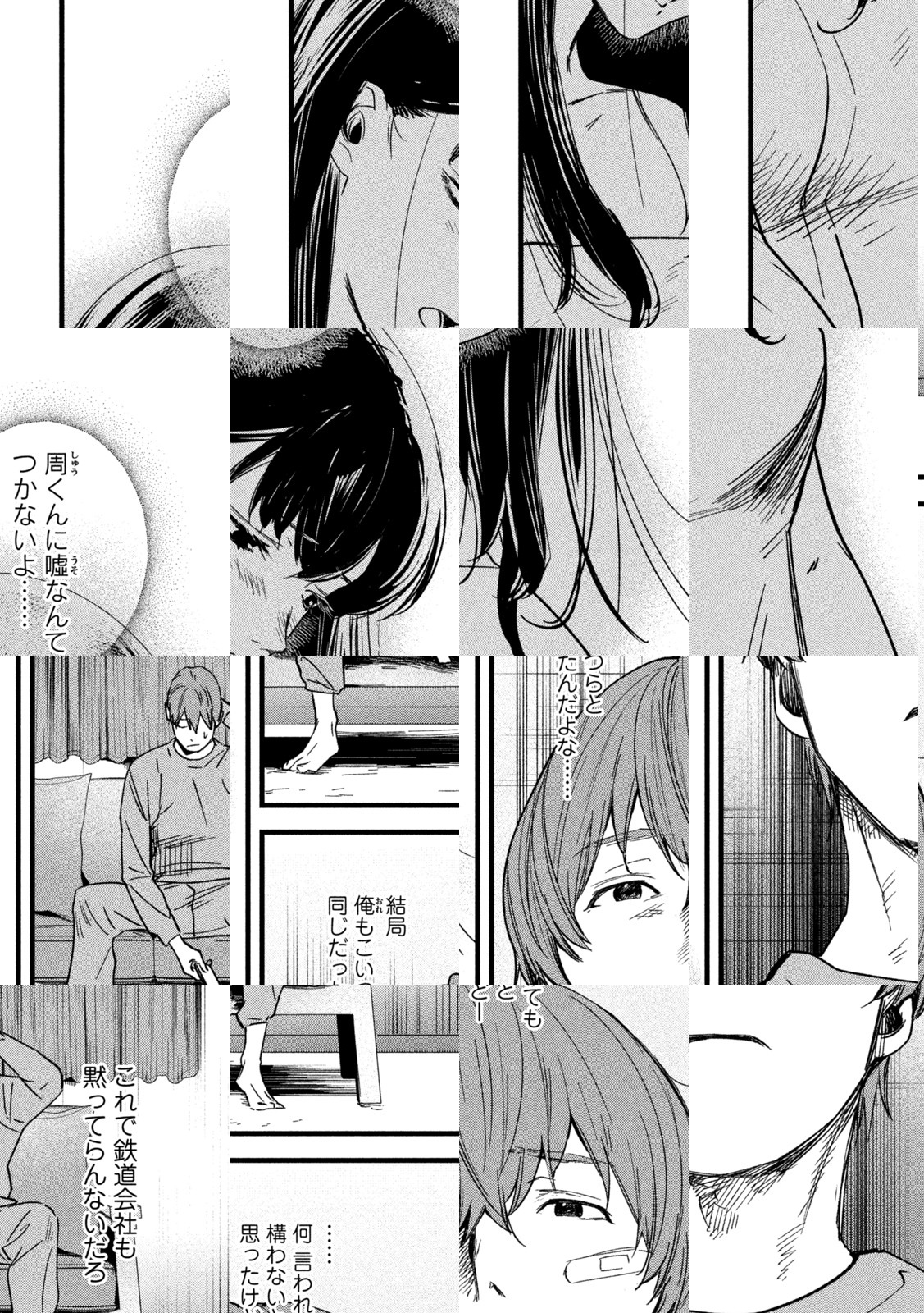 駅や電車内を徘徊している、駅員の格好をした奇妙な風貌の男。正体不明の男の姿が見えてしまった者は、彼が手に持つ大バサミで、その駅を人生の終点にされてしまう!! 恋人の周とのつつましいキャンパスライフを送っていた女子大生・月子にも、彼の姿が見えてしまい…!? 一度読んだらも、この恐怖から乗り換えられない…戦慄と衝撃が連結のトレインホラー!!