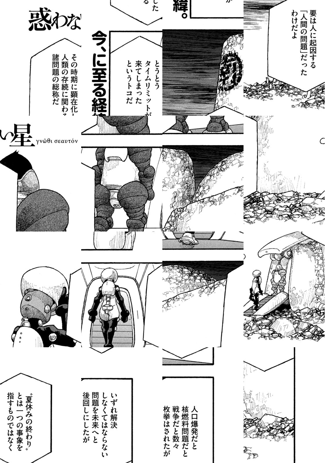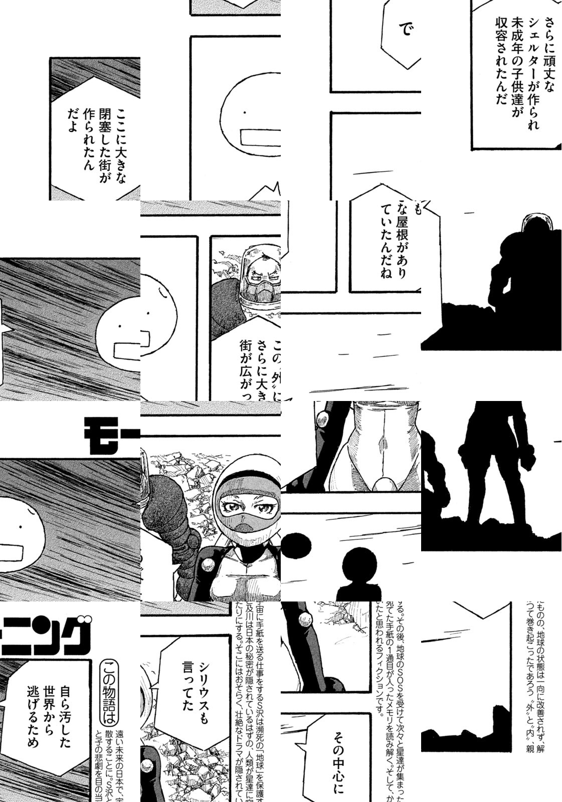 私達が子供たち、またその子供たちに残したのは、七色の空と灰色の嵐でした。空は曜日によって七色に変化し、街中に愛と希望と萌えがあふれる「内側」の世界。主人公S沢はそこから職場に向かう。灰色の嵐が吹き荒れ、防御服がないと大地を踏むことすらできぬ「外側」の世界へ——。『もやしもん』でミクロの世界を活写した石川雅之の、衝撃的ブランニューワールド!!