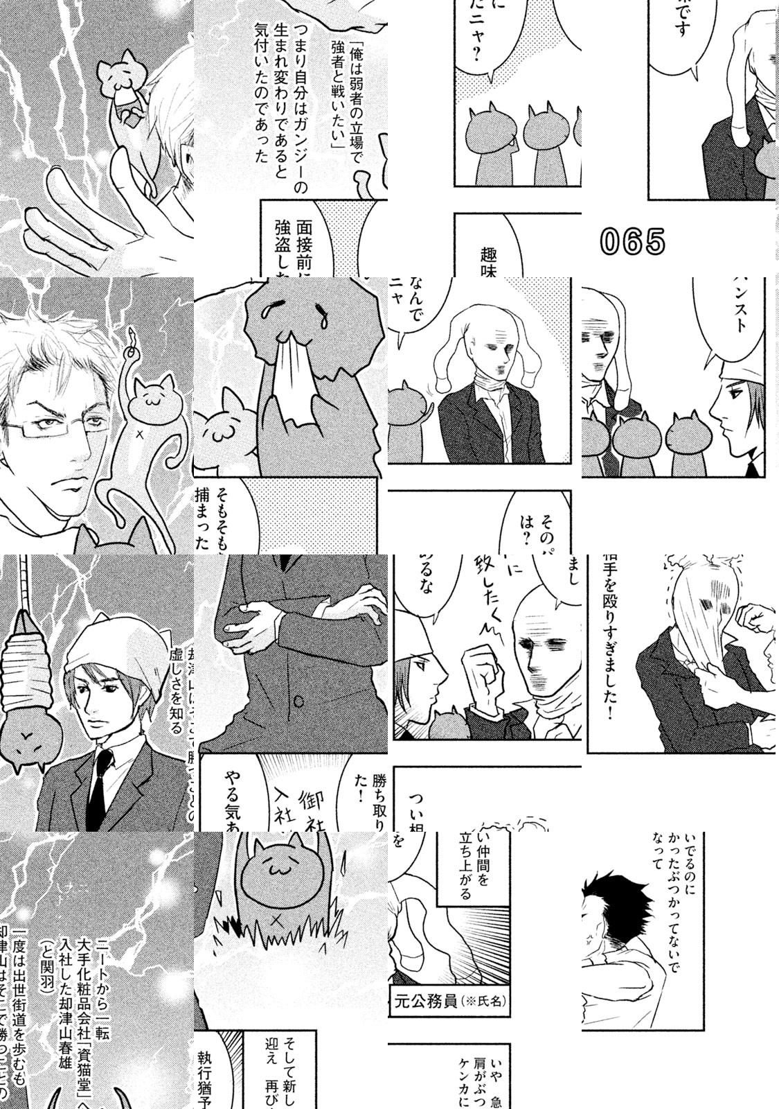 日本のどこかの道ばたにロシアンブルーがすてられていました。出会いをまちわびるうち、捨て猫は三びきにふえていました。だれも彼らをひろってくれません。ところが神様は猫たちを決してみすてませんでした。猫耳の帽子をかぶった無気力で無表情でブラブラしている若者が、三びきの新しい同居人、あるいはお父さんとなったのです。若者の名前は却津山春雄(きゃつやまはるお)、通称・キャッツ。捨て猫たちと若者の熱い友情がきっとみなさんの胸をうつことでしょう。ご家族そろってどうぞ『クレムリン』を応援してください。 【あらすじ】大学生という名の無職・却津山春雄は道ばたに捨てられていたロシアンブルーを無慈悲にも黙殺するが,小さな命は『南極物語』のタロ・ジロさながらにたくましく一冬を耐え抜いたのであった。却津山は猫三匹との同居を決意。強くしたたかに生きてほしいとの願いを込め、歴史上の英雄にあやかり、総称「関羽」と命名する。度重なる挫折のために深く絶望した却津山の魂は少しずつ癒され……。