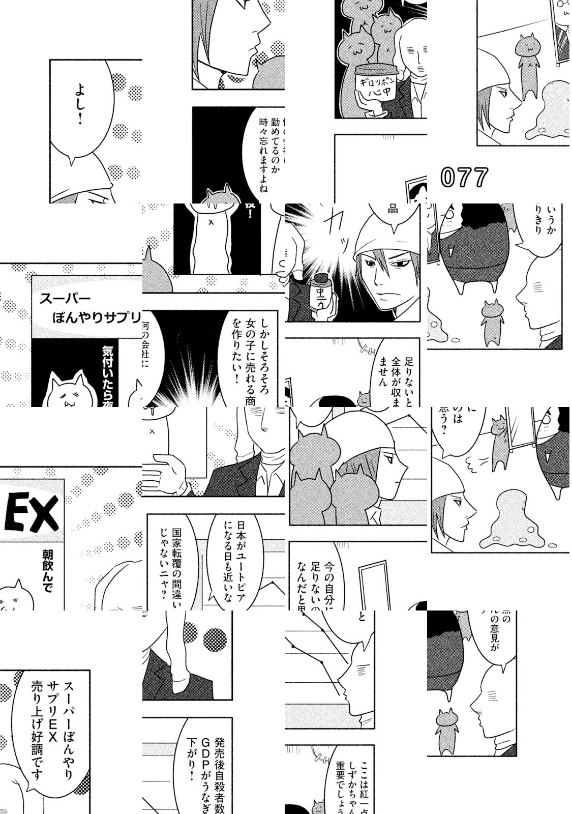 日本のどこかの道ばたにロシアンブルーがすてられていました。出会いをまちわびるうち、捨て猫は三びきにふえていました。だれも彼らをひろってくれません。ところが神様は猫たちを決してみすてませんでした。猫耳の帽子をかぶった無気力で無表情でブラブラしている若者が、三びきの新しい同居人、あるいはお父さんとなったのです。若者の名前は却津山春雄(きゃつやまはるお)、通称・キャッツ。捨て猫たちと若者の熱い友情がきっとみなさんの胸をうつことでしょう。ご家族そろってどうぞ『クレムリン』を応援してください。 【あらすじ】大学生という名の無職・却津山春雄は道ばたに捨てられていたロシアンブルーを無慈悲にも黙殺するが,小さな命は『南極物語』のタロ・ジロさながらにたくましく一冬を耐え抜いたのであった。却津山は猫三匹との同居を決意。強くしたたかに生きてほしいとの願いを込め、歴史上の英雄にあやかり、総称「関羽」と命名する。度重なる挫折のために深く絶望した却津山の魂は少しずつ癒され……。