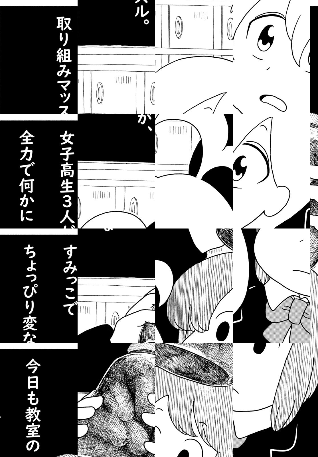 とある高校の教室の隅っこでちょっぴり変な女子高生が全力で何かに取り組むお話。教室で餃子を焼いたり、コーヒー豆を挽いたり。時には〝おでん〟たちの葛藤を妄想したり…。ゆるく描かれた3人の女子高生が教室の隅で織りなすシュールギャグ漫画!デフォルメされた可愛らしいキャラクターが織りなす日常の中に突然登場する写実的な絵柄がクセになります。