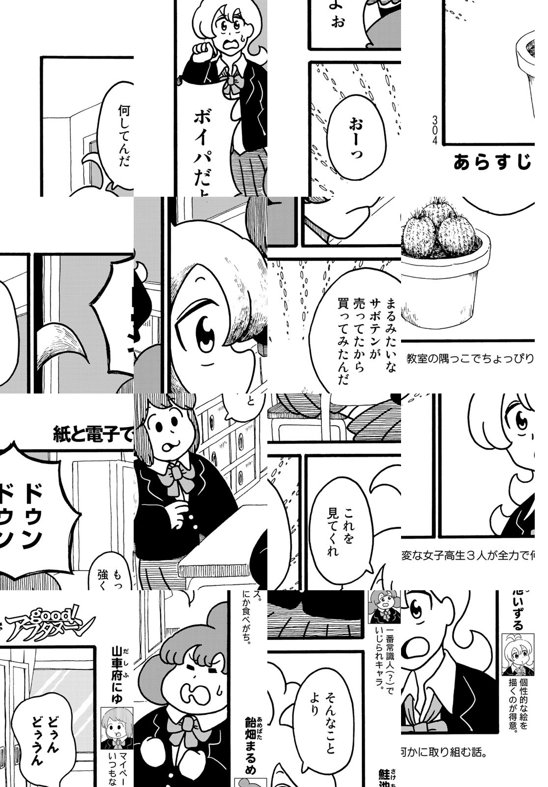 とある高校の教室の隅っこでちょっぴり変な女子高生が全力で何かに取り組むお話。教室で餃子を焼いたり、コーヒー豆を挽いたり。時には〝おでん〟たちの葛藤を妄想したり…。ゆるく描かれた3人の女子高生が教室の隅で織りなすシュールギャグ漫画!デフォルメされた可愛らしいキャラクターが織りなす日常の中に突然登場する写実的な絵柄がクセになります。