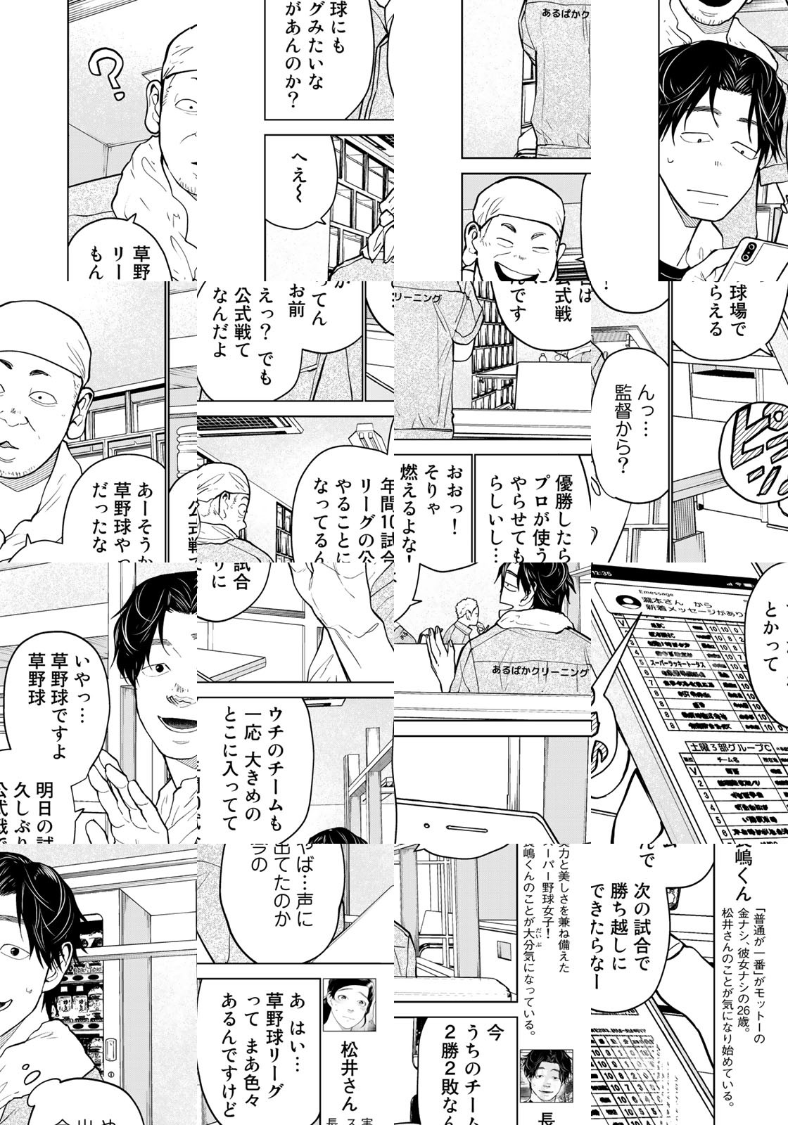 平凡なサラリーマン・長嶋君の趣味は草野球。ある日、チームの助っ人としてグラウンドに舞い降りたのは謎の野球女子・松井さんだった!! その可憐さに敵も味方も浮足立つ中で、松井さんの第一打席は──!?