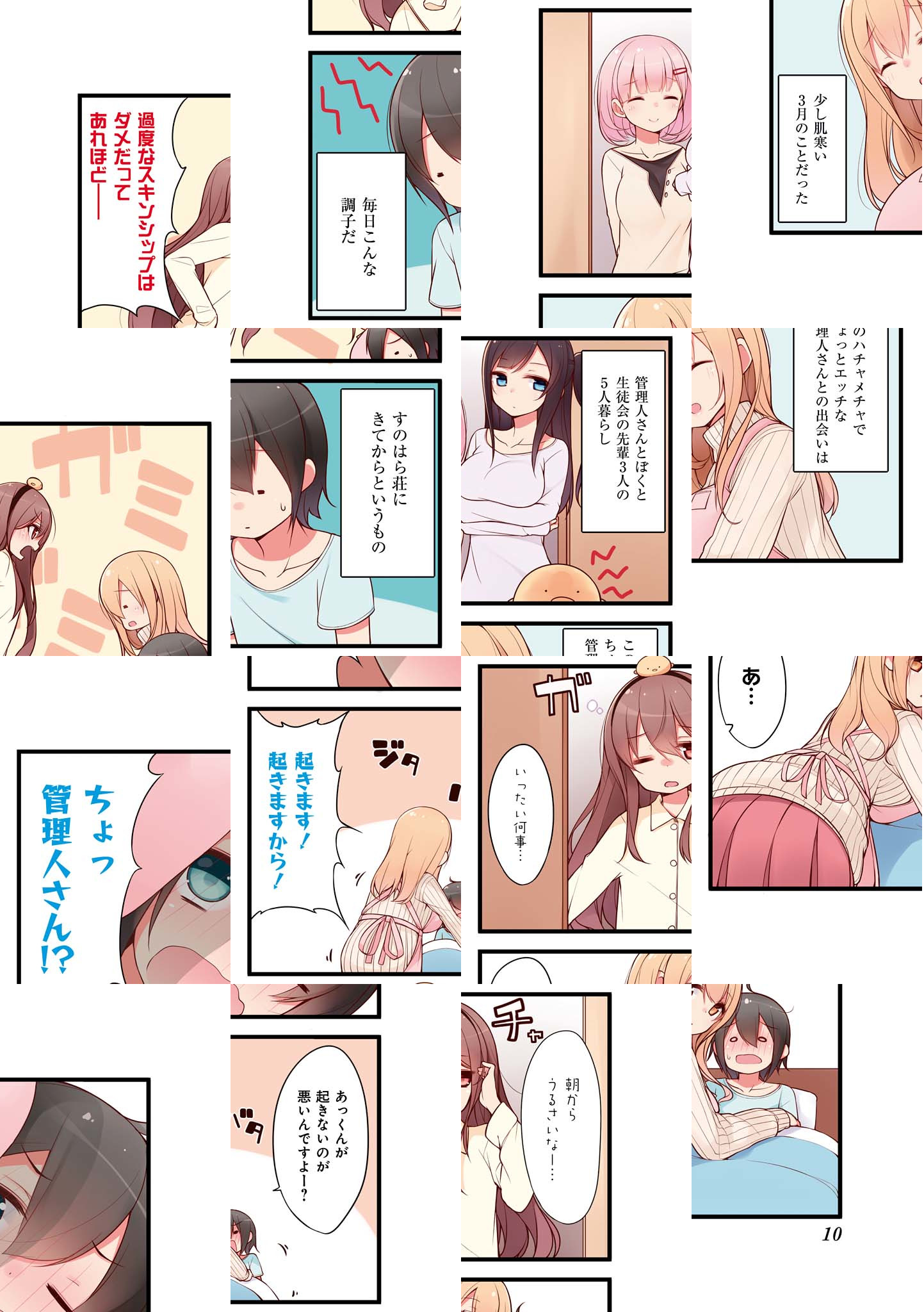 見た目のせいで男扱いされてこなかった椎名亜樹は、自分を変えようと中学校入学を機に東京へ出てすのはら荘に入寮する。しかしそこで亜樹を待っていたのは、天然でいたずら好きなすのはら荘の管理人さん・春原彩花に心も体もかわいがられる毎日だった。さらに、ほかの同居人も全員年上の女の子で…。