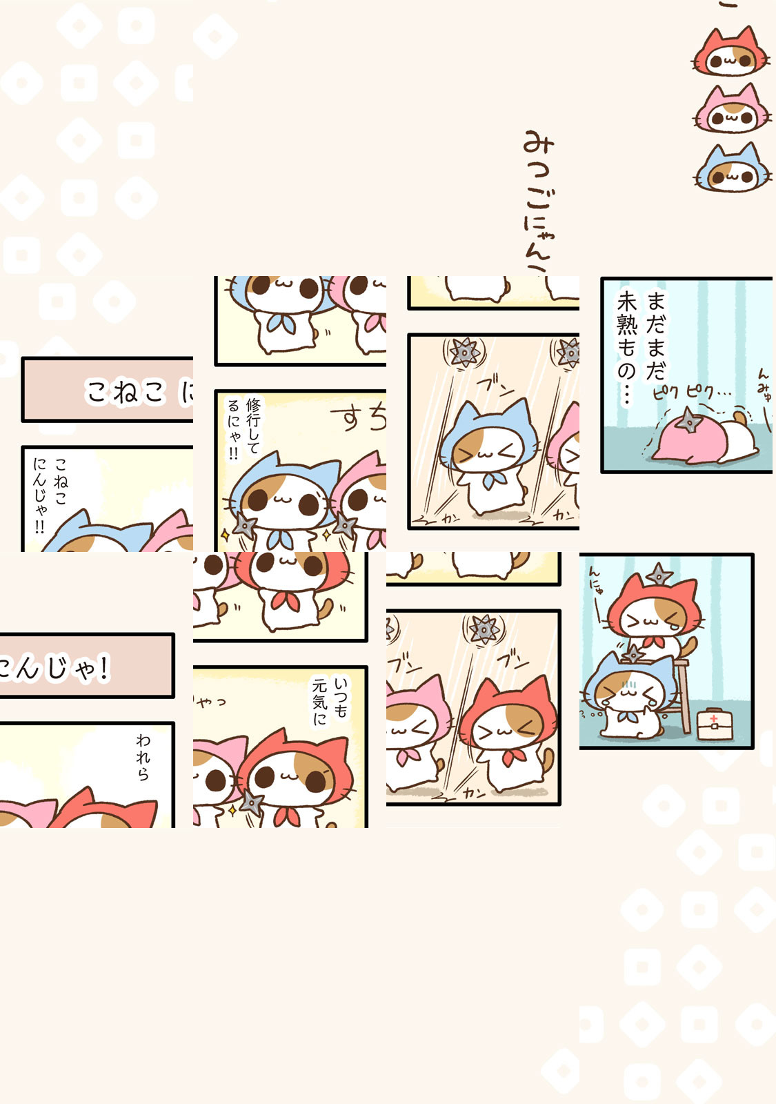 ぼくたち猫にんじゃは今日も忍の修行中。組頭先生に教えをこいながら、かっこいい忍者を目指しているの! ノラ猫のフリをしてみたり、まきびししてみたり…しっぱいもしちゃうけど、3匹あつまればだいじょうぶ! 今日もげんきに、いざにんむ! 一途にがんばる猫にんじゃたちに、心の底から…ほっこり♪ 子猫×忍びの最強癒キュンまんが、誕生です!