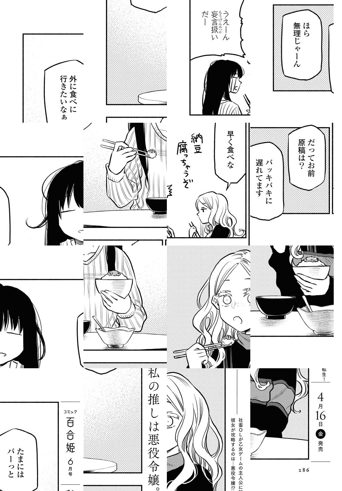 〆切に追われる漫画家の「後輩」は、どうにか心をパッと明るくしたい。そんな時、「現実逃避のプロ」を自任する無職の「先輩」からアドバイス(誘惑)が…!携帯を封印(物理)したり、意味もなく終点の駅まで行ったり、斜め上の贅沢をしてみたり…。限界漫画家と、顔は良い無職。二人暮らしな現実逃避コメディ!!