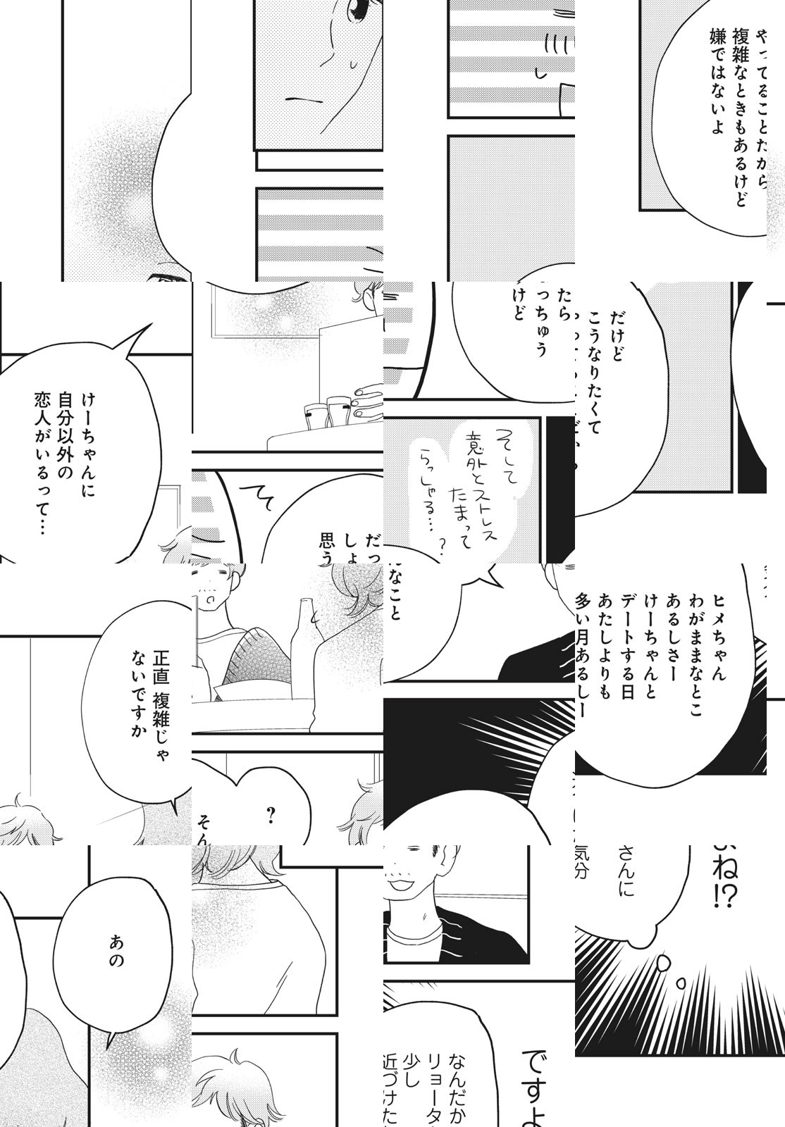 宮本サキ、上京して2年。仕事をこなすことに精一杯の毎日を送っていたら、彼氏どころか友達の作り方もわからなくなってしまっていた。そんなとき、幼なじみのけーちゃんに10年以上ぶりに再会し、タワーマンションでのシェアハウスに誘われる。「ひとりぼっちだった日々が何か変わるかも…」と、シェアハウスへの参加を決めるサキ。だけどそこには、けーちゃんの他にも住人がいて、その2人はけーちゃんの恋人で…!? 幼なじみのけーちゃんと、彼の恋人2人とタワーマンションでシェアハウス!? 新しい恋のカタチに出会う、ちょっと刺激的なひとつ屋根の下ラブ!