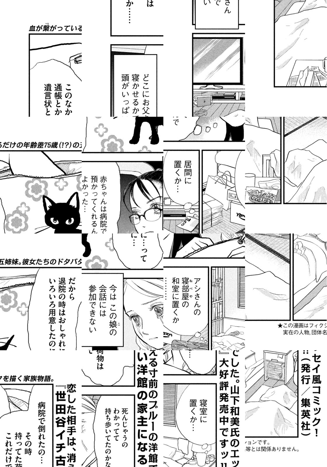 百歳の父の危篤がきっかけで、疎遠だった腹違いの四姉妹が再集結。家族、お金、居場所、生きがい、それぞれ何かを失っている彼女たちがぶつかりながら、見つけていくものとは——。『ランド』で現代社会の不安を描き切った山下和美が次に挑むのは「家族」! 毎日が愛おしくなる?ファミリーコメディ、開幕!