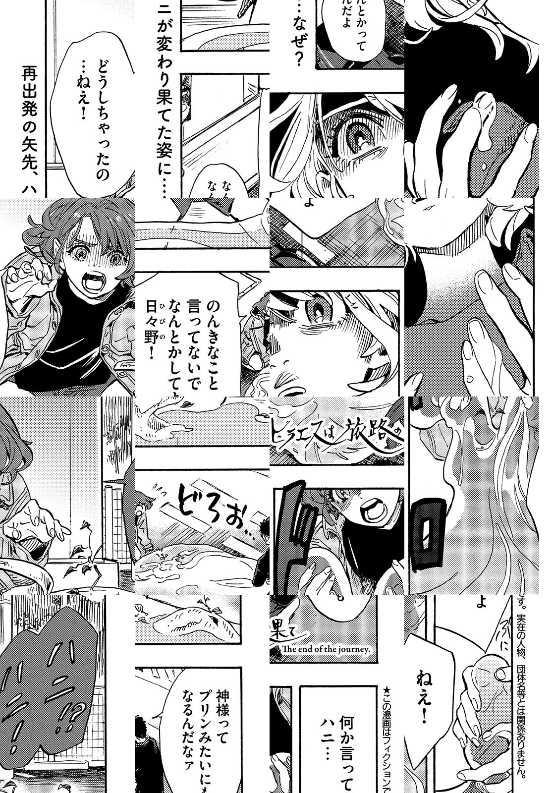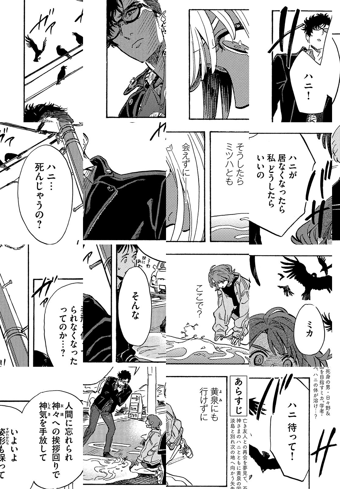親友の死にショックを受け、自分も死のうとトラックの前に飛び出した少女・ミカ。彼女を救ったのは、不死身の男・日々野と、神を自称する青年(?)だった。二人が黄泉の国を目指していることを知ったミカは、その旅への同行を志願する。友人との再会を夢見て……! 鎌谷悠希が描く、蒼く切実なる旅物語!