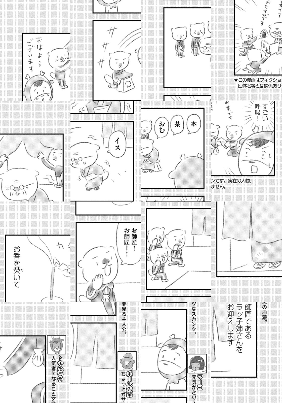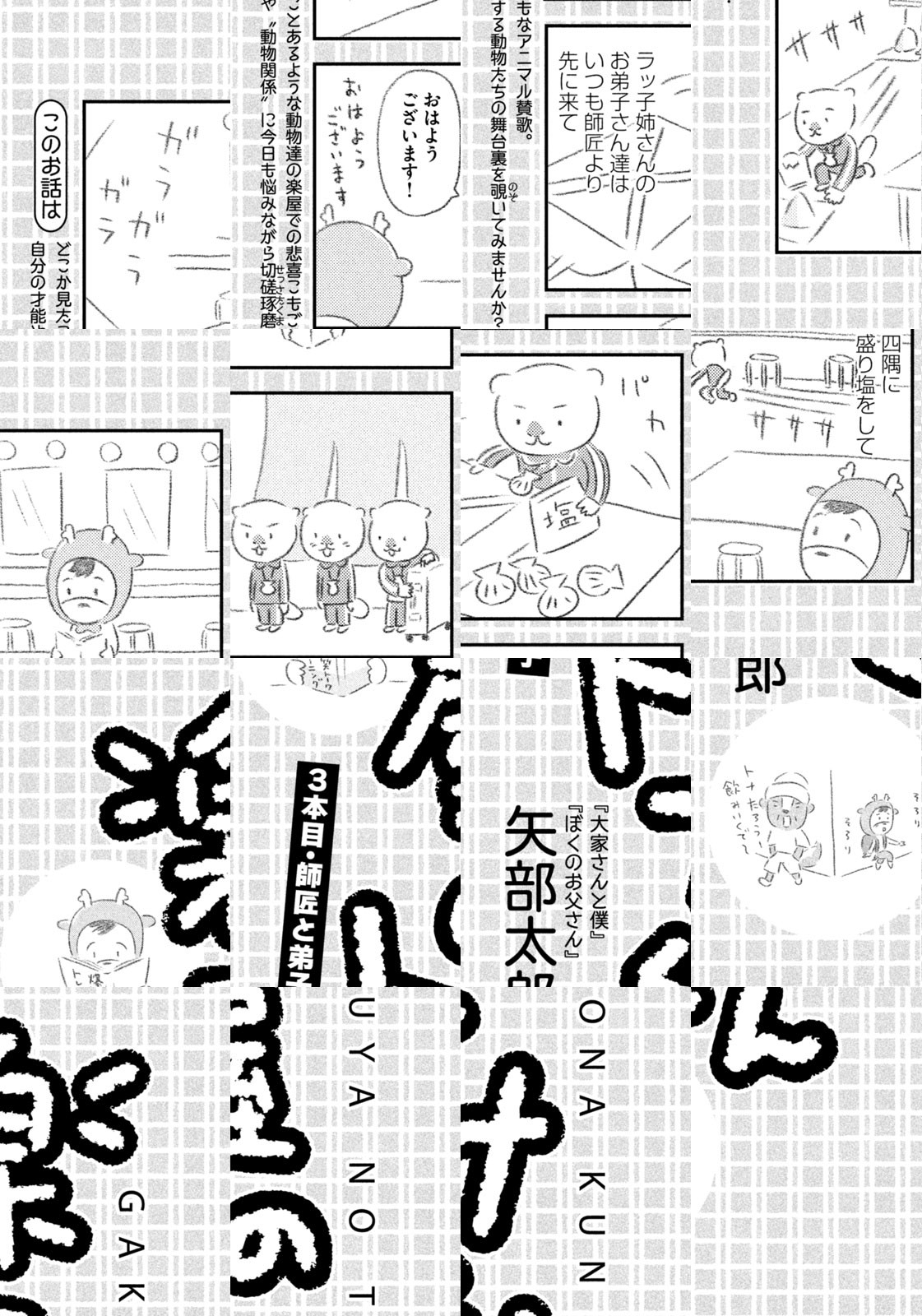 先輩にはいびられ、後輩には舐められ、お客さんには気づかれない主人公・トナカイのトナたろう、ちょっとガサツでデリカシーのないスカンクのポール先輩、元気すぎるお猿のアーコ、大人気のパンダくんなど、どこか見たことあるような動物たちの楽屋での悲喜こもごもなアニマル賛歌。自分の才能や“動物関係”に今日も悩みながら切磋琢磨する動物たちの舞台裏を覗いてみませんか?