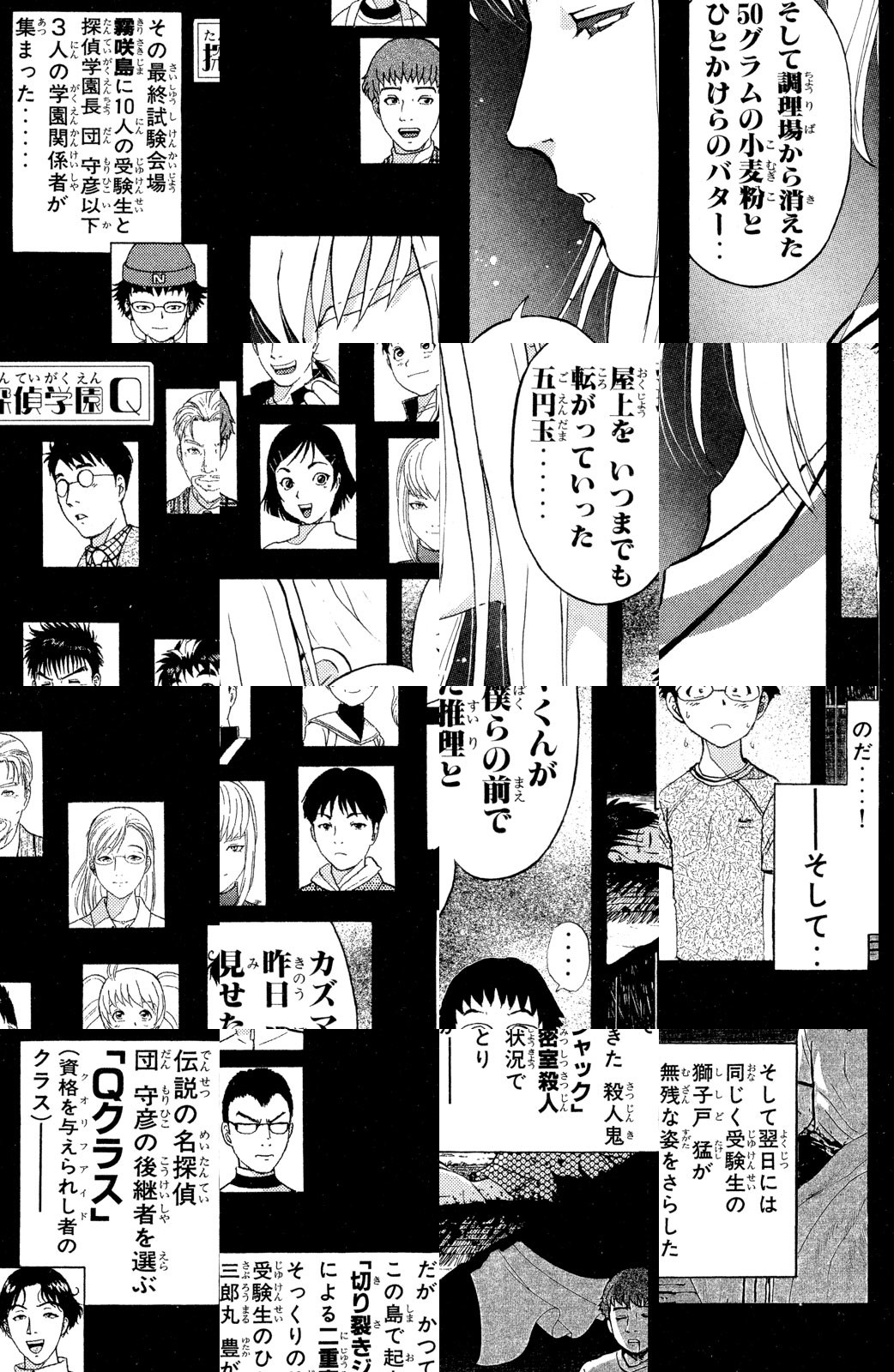 「世界一の探偵になる!」その願いをかなえるべく、キュウが挑むのは、伝説の名探偵・団守彦が主催する“探偵学園”の型破りな入学試験! 瞬間記憶能力者メグ、野生児キンタ、IT小僧カズマといった強力なライバルと共に、数々の超難解な謎を解き明かせ! 最高の探偵養成クラス「Qクラス」に入るために!!