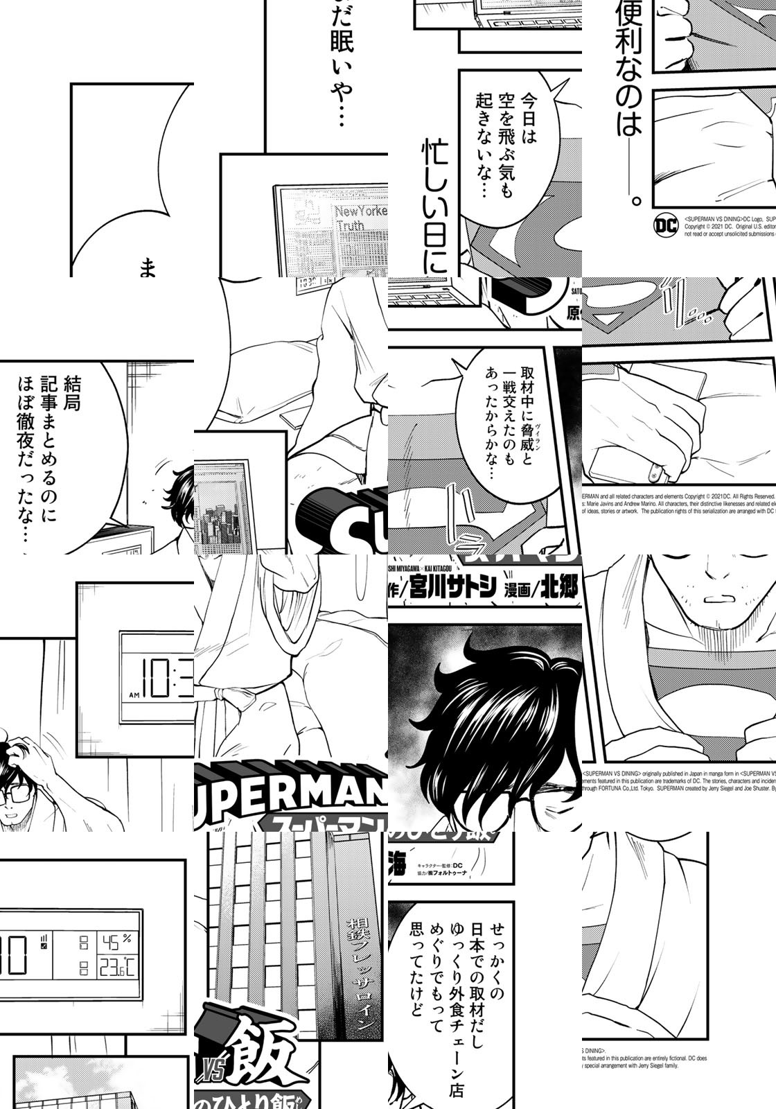 スーパーヒーローも腹は減る。地上最強の男・スーパーマンとして忙しく働く彼の毎日の楽しみ——それは日本で食べるランチ。超人的聴力で自分のお腹が鳴る音が聞こえたら、路地裏でスーツを脱ぎ捨て、日本の外食チェーンへ飛んでいく。釜飯を熱光線で温めたり、天丼の具材でジャスティスリーグを結成したり、ランチタイムのスーパーマンはマイペースでいい! DCコミックス公認のスーパーマン×グルメ漫画!