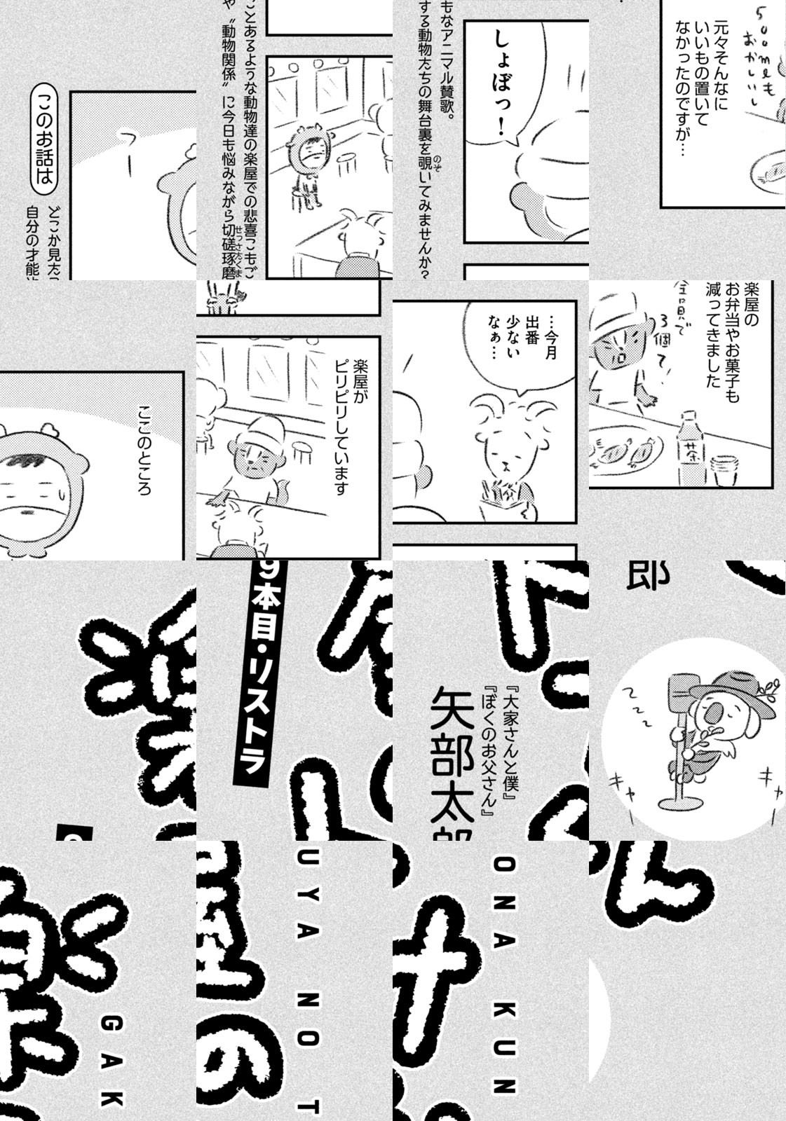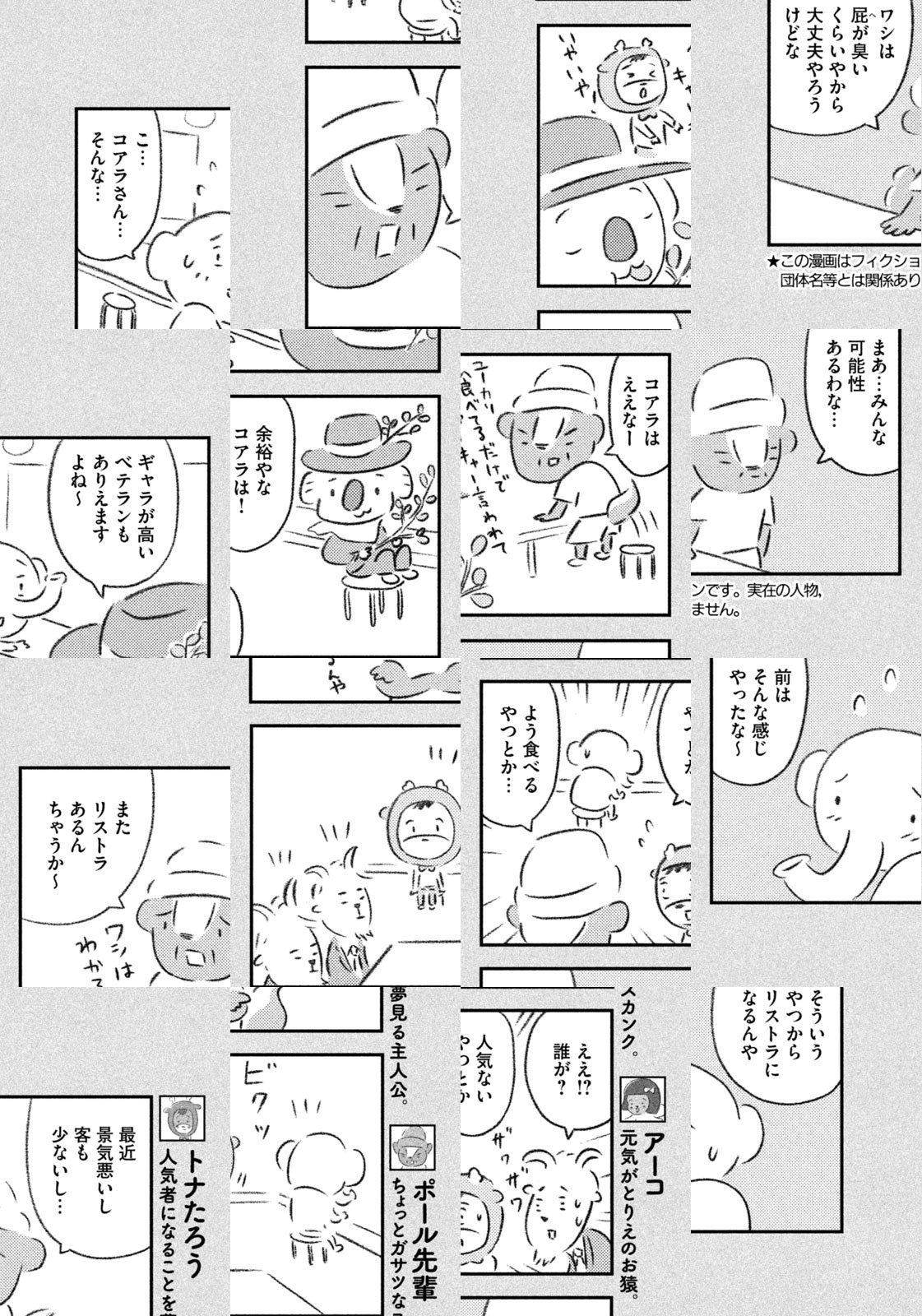 先輩にはいびられ、後輩には舐められ、お客さんには気づかれない主人公・トナカイのトナたろう、ちょっとガサツでデリカシーのないスカンクのポール先輩、元気すぎるお猿のアーコ、大人気のパンダくんなど、どこか見たことあるような動物たちの楽屋での悲喜こもごもなアニマル賛歌。自分の才能や“動物関係”に今日も悩みながら切磋琢磨する動物たちの舞台裏を覗いてみませんか?