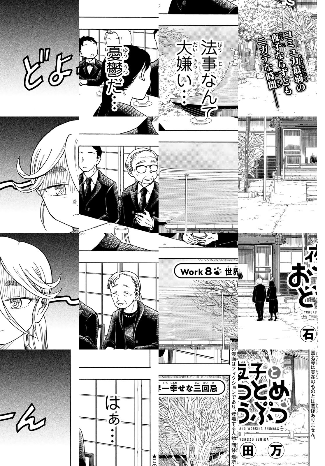 コミュニケーションが苦手なイラストレーター・影野夜子が住んでいる町は、いろんなお店でどうぶつが働く不思議な街で…。カフェラテづくりが得意な猫のウエイターさんをはじめ、パンダの保育士さん、カメのレジ打ち係さん、などなど。人が苦手な夜子でも、この町なら毎日が楽しい!どうぶつたちの可愛らしすぎるおつとめっぷりに笑いながら癒されるショートコメディ!!