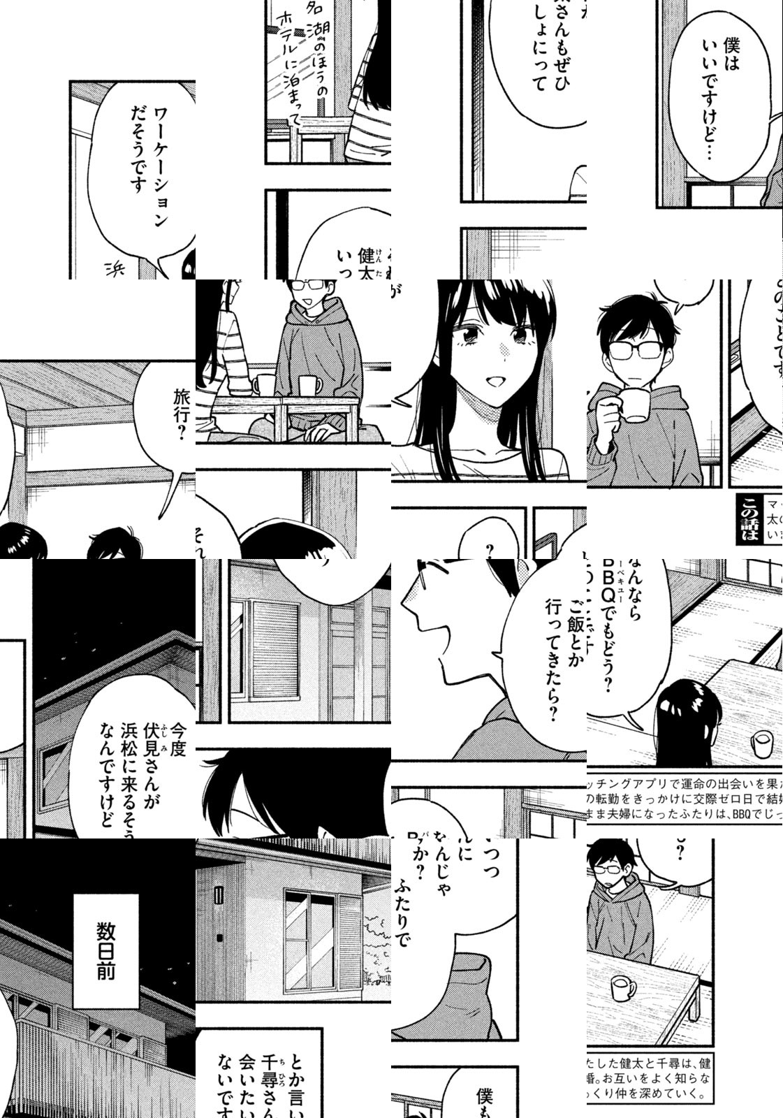 マッチングアプリで運命の出会いを果たした、健太と千尋。奥手すぎて最初の一歩を踏み出せずにいるふたりが、健太の浜松への転勤をきっかけに急進展。なんと…交際ゼロ日で結婚することに! お互いをよく知らないまま夫婦になったふたりは、毎週末のBBQでじっくり仲を深めていく――。じっくり育てるスローな週末新婚BBQライフ、始めます!