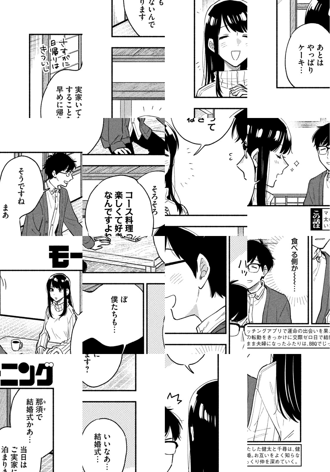 マッチングアプリで運命の出会いを果たした、健太と千尋。奥手すぎて最初の一歩を踏み出せずにいるふたりが、健太の浜松への転勤をきっかけに急進展。なんと…交際ゼロ日で結婚することに! お互いをよく知らないまま夫婦になったふたりは、毎週末のBBQでじっくり仲を深めていく――。じっくり育てるスローな週末新婚BBQライフ、始めます!