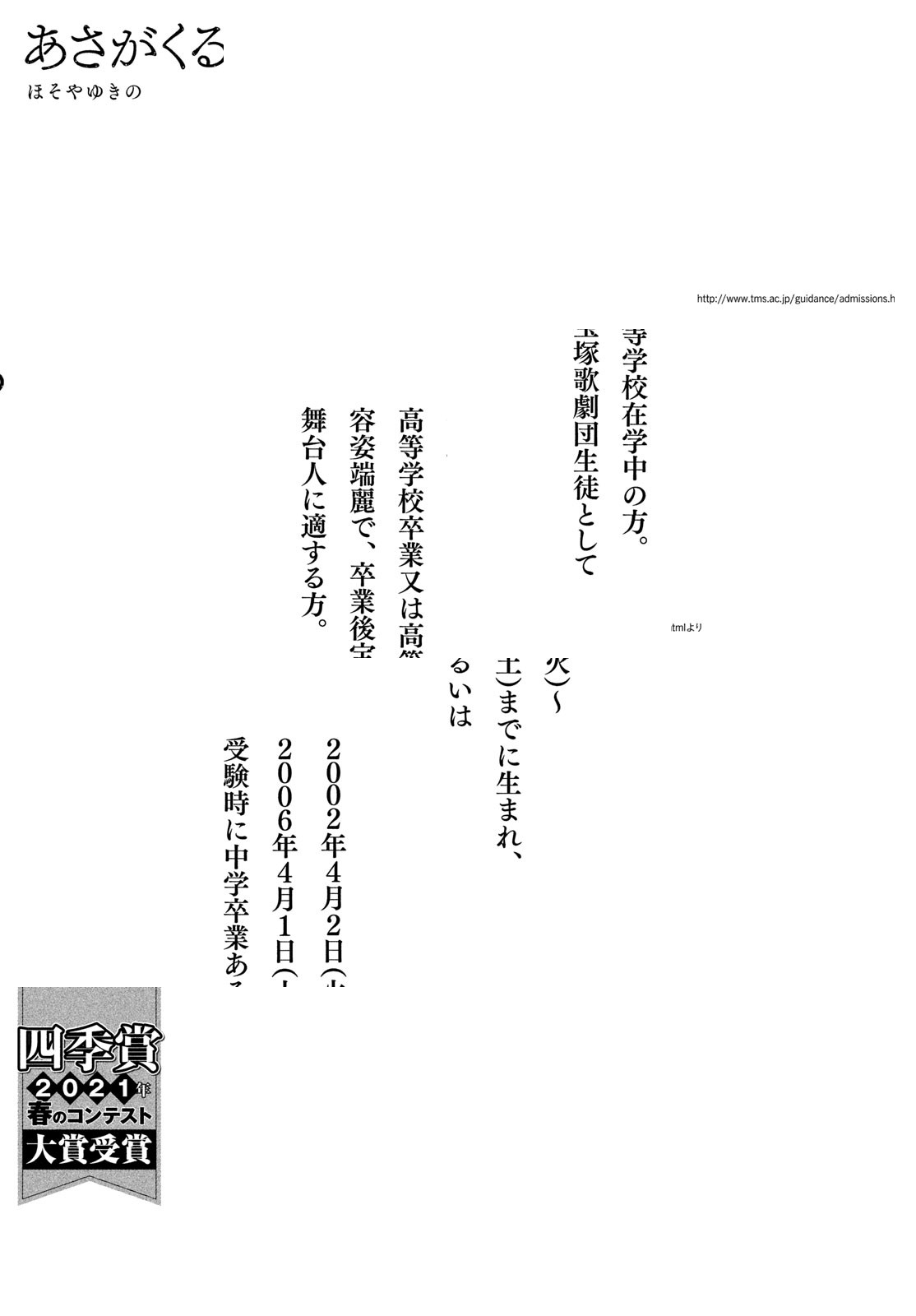 【アフタヌーン四季賞2021春 四季大賞】大学受験のため予備校に通う朝顔は、自分が失敗した宝塚音楽学校に挑むくるみの指導を頼まれる。くるみにかつての自分を重ねつつ、 受験の失敗によるダメージで、省みることができなかった自分の成長の過程をゆっくりと振り返る。