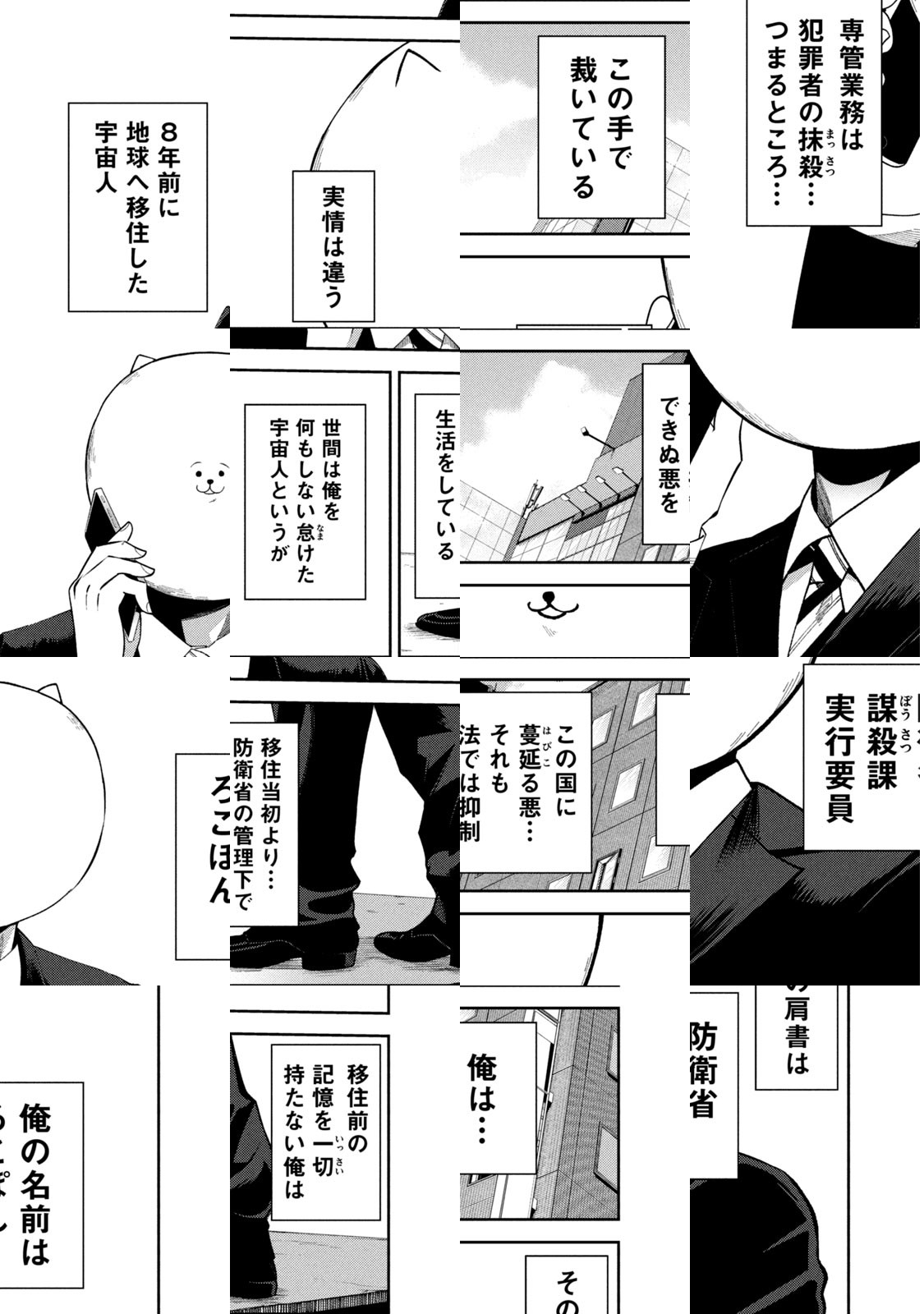 その宇宙人、殺し屋につき。ある日突然地球にやってきた、宇宙人ろこぽん。政府が彼に命じたのは、ボランティア活動だった。…表向きは。ろこぽんの本当の仕事は、「宇宙人は殺人罪に問われない」というむちゃくちゃな抜け穴を利用した殺し屋! 裏で本業をがんばるろこぽんのお仕事奮闘記、開幕。