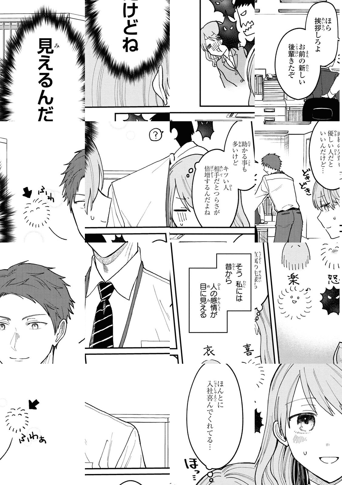 新入社員の志野聡子。場の空気が読めると褒められることも多い彼女だが、それもそのはず。実は志野は、 喜怒哀楽さまざまな感情がふわふわ漂う謎の生き物として見えてしまう不思議な能力の持ち主。その能力から、無愛想で怖そうに見える直属の上司の慈(うつみ)が実は心優しい人物だと知ってしまい…? ちょっと不思議でほのぼのあたたか、ほんのりラブのオフィスコメディ。