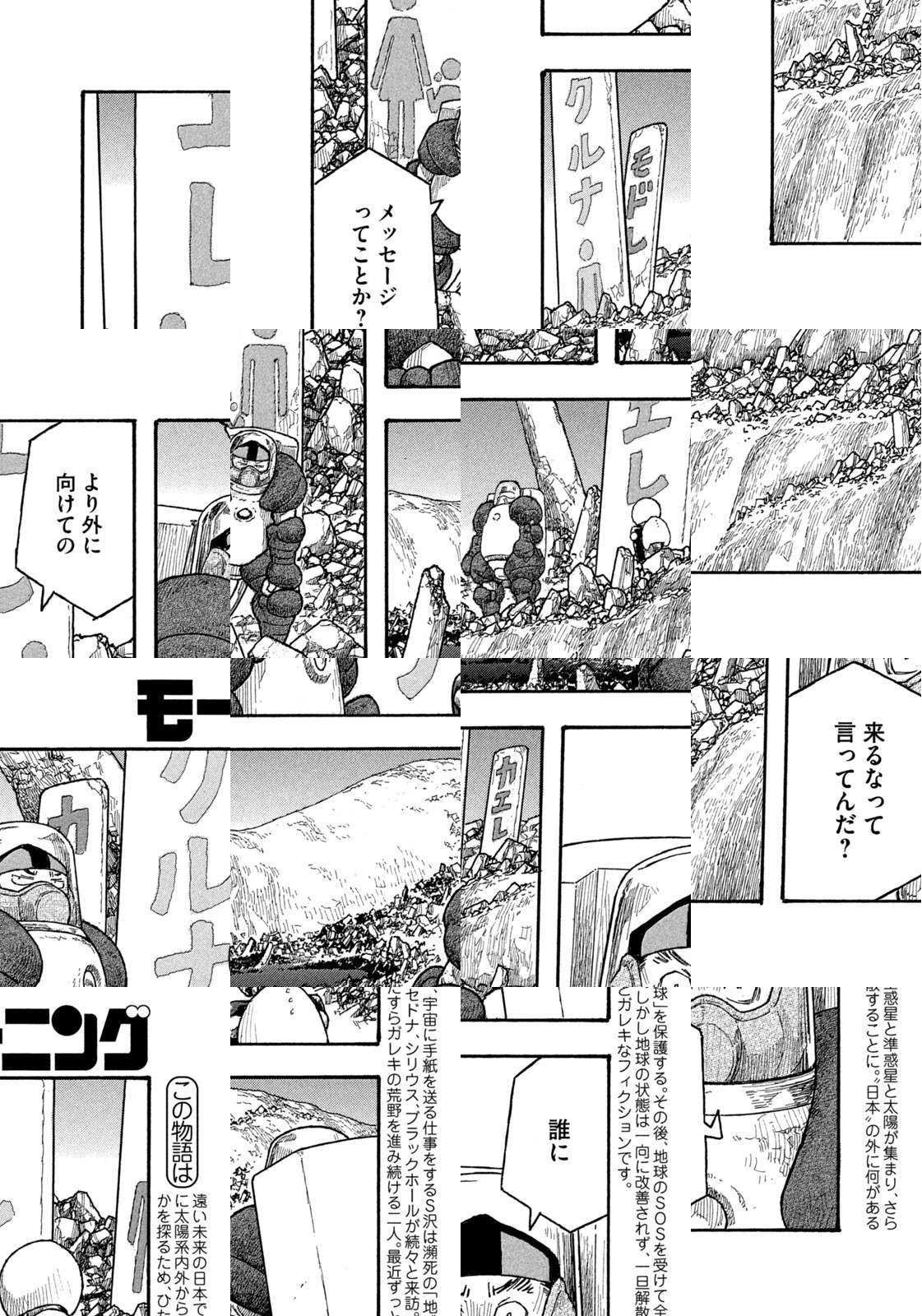 私達が子供たち、またその子供たちに残したのは、七色の空と灰色の嵐でした。空は曜日によって七色に変化し、街中に愛と希望と萌えがあふれる「内側」の世界。主人公S沢はそこから職場に向かう。灰色の嵐が吹き荒れ、防御服がないと大地を踏むことすらできぬ「外側」の世界へ——。『もやしもん』でミクロの世界を活写した石川雅之の、衝撃的ブランニューワールド!!
