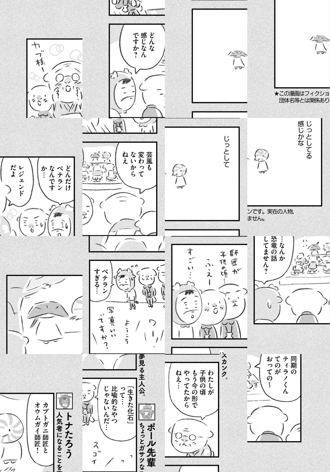 先輩にはいびられ、後輩には舐められ、お客さんには気づかれない主人公・トナカイのトナたろう、ちょっとガサツでデリカシーのないスカンクのポール先輩、元気すぎるお猿のアーコ、大人気のパンダくんなど、どこか見たことあるような動物たちの楽屋での悲喜こもごもなアニマル賛歌。自分の才能や“動物関係”に今日も悩みながら切磋琢磨する動物たちの舞台裏を覗いてみませんか?