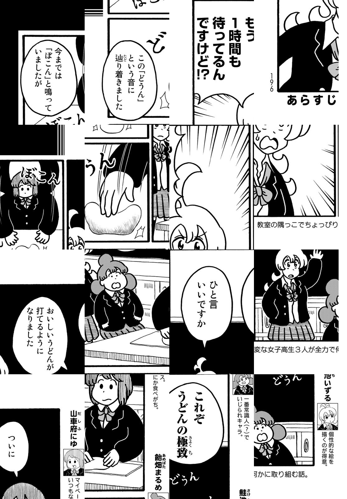 とある高校の教室の隅っこでちょっぴり変な女子高生が全力で何かに取り組むお話。教室で餃子を焼いたり、コーヒー豆を挽いたり。時には〝おでん〟たちの葛藤を妄想したり…。ゆるく描かれた3人の女子高生が教室の隅で織りなすシュールギャグ漫画!デフォルメされた可愛らしいキャラクターが織りなす日常の中に突然登場する写実的な絵柄がクセになります。