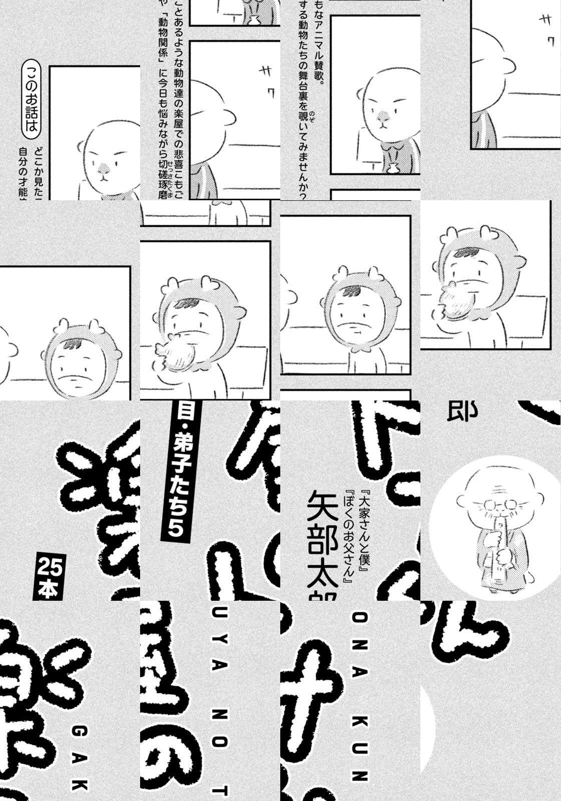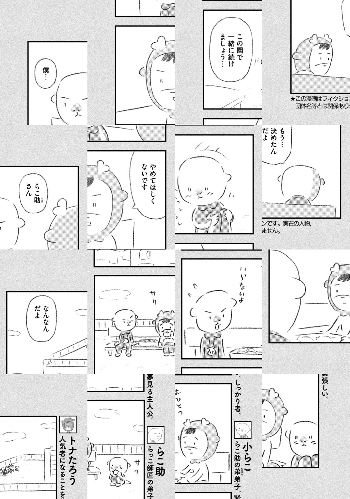 先輩にはいびられ、後輩には舐められ、お客さんには気づかれない主人公・トナカイのトナたろう、ちょっとガサツでデリカシーのないスカンクのポール先輩、元気すぎるお猿のアーコ、大人気のパンダくんなど、どこか見たことあるような動物たちの楽屋での悲喜こもごもなアニマル賛歌。自分の才能や“動物関係”に今日も悩みながら切磋琢磨する動物たちの舞台裏を覗いてみませんか?