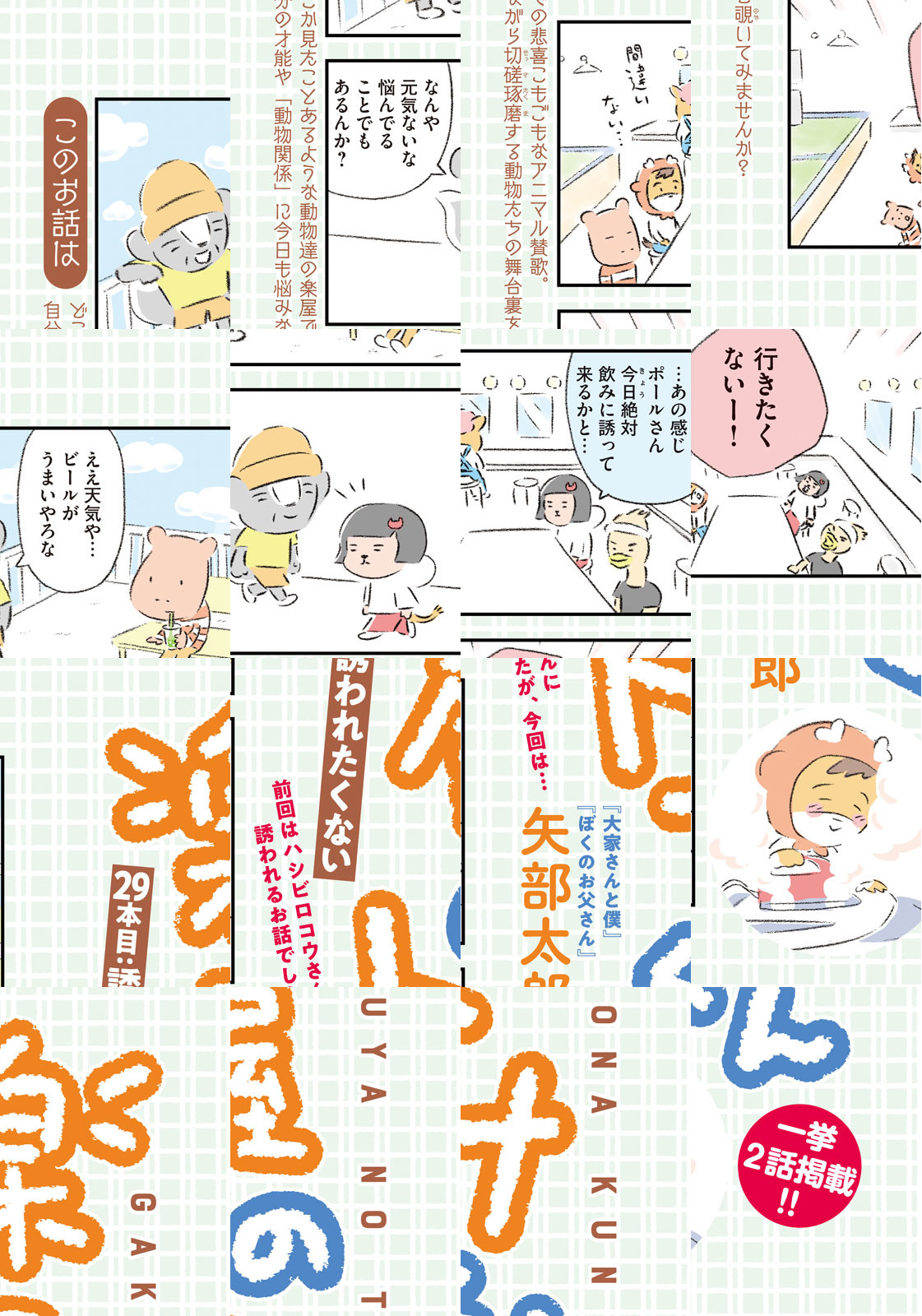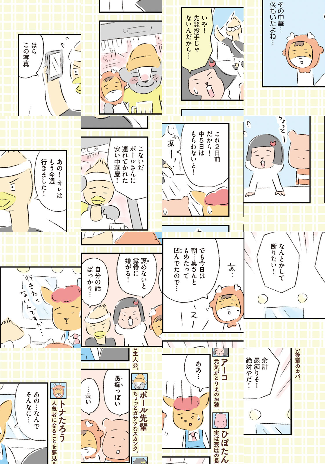 先輩にはいびられ、後輩には舐められ、お客さんには気づかれない主人公・トナカイのトナたろう、ちょっとガサツでデリカシーのないスカンクのポール先輩、元気すぎるお猿のアーコ、大人気のパンダくんなど、どこか見たことあるような動物たちの楽屋での悲喜こもごもなアニマル賛歌。自分の才能や“動物関係”に今日も悩みながら切磋琢磨する動物たちの舞台裏を覗いてみませんか?