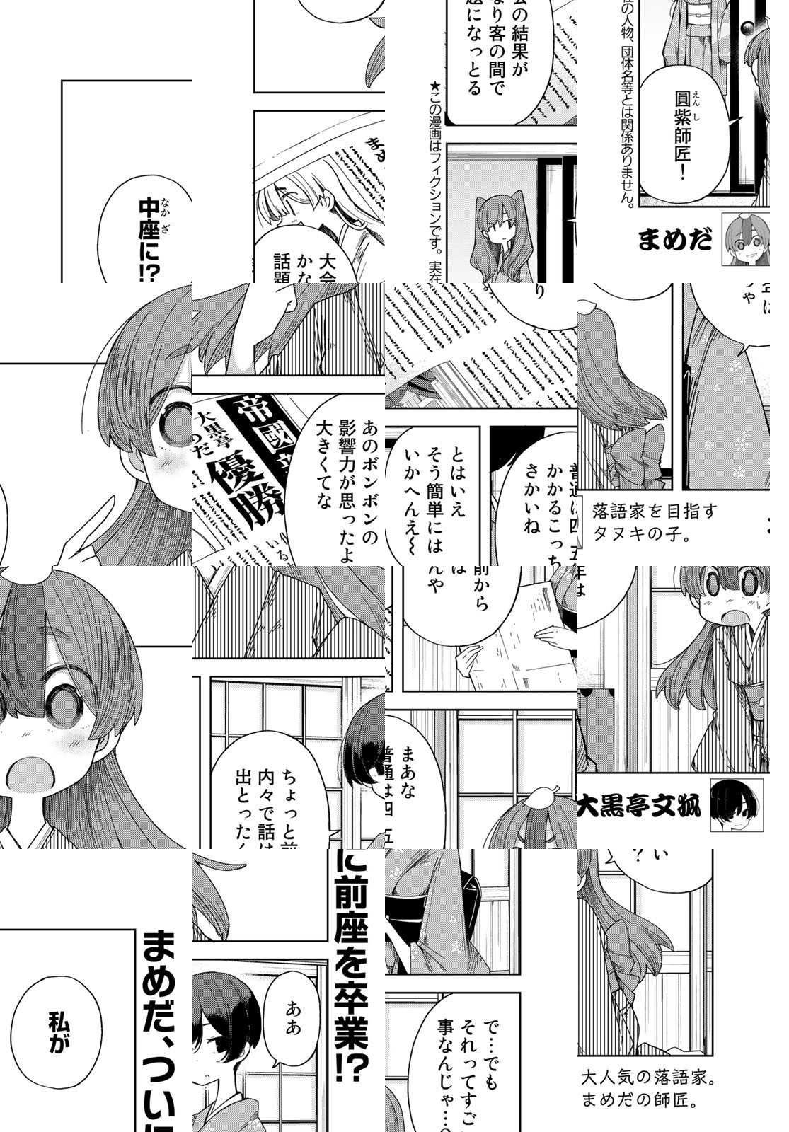 豆狸の女の子・まめだは、人気落語家・文狐の狐の芸に魅了され、弟子入りを志願! でも文狐には何か秘密があるようで…? 大正時代の大阪で師弟が繰り広げるハッピー落語師弟愛!