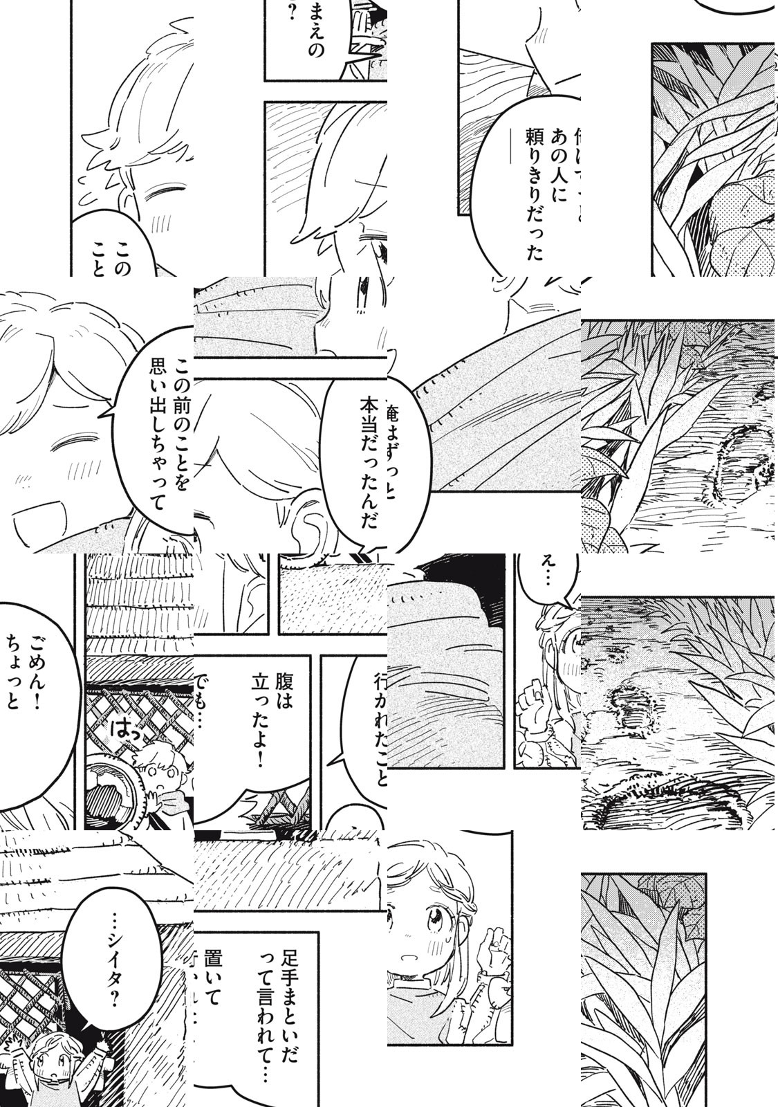 こびとたちが暮らす森の中の集落。そこに住む「シイタ」は、親友の「ナラ」と近くの森を庭にして、日々冒険をしながら過ごしている。危険な動物たちがいる森の中でも、集落にいれば安全で快適だ。ある日ふたりは、集落から遠く離れた場所に、人が出したと思われる煙を見つける。ナラは、大人が何を隠しているのか、森で何が起こったのかを確かめるため、集落を出ようとシイタを誘う。そこには、シイタの父親の命を狙う「イズナ」がいた。
