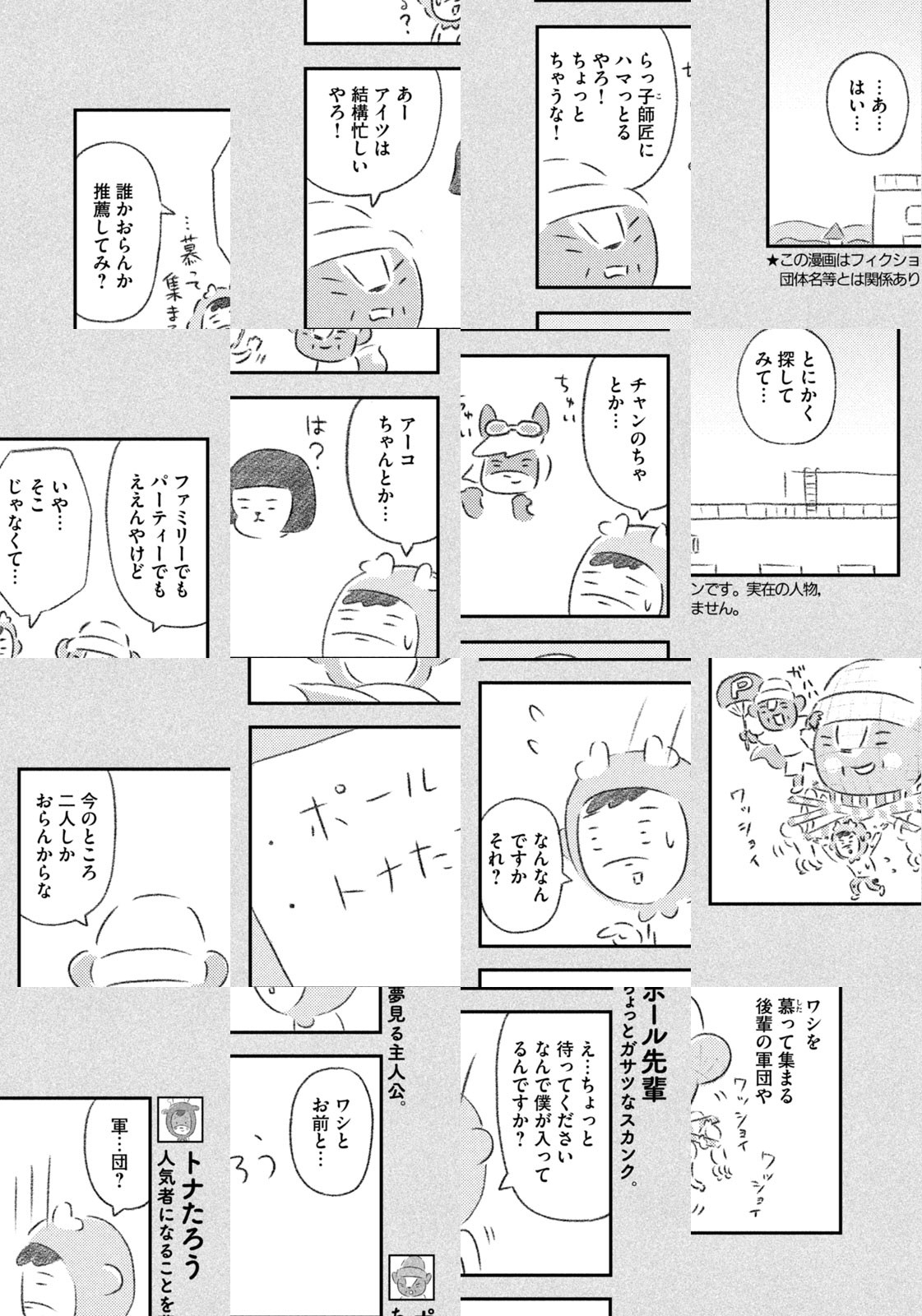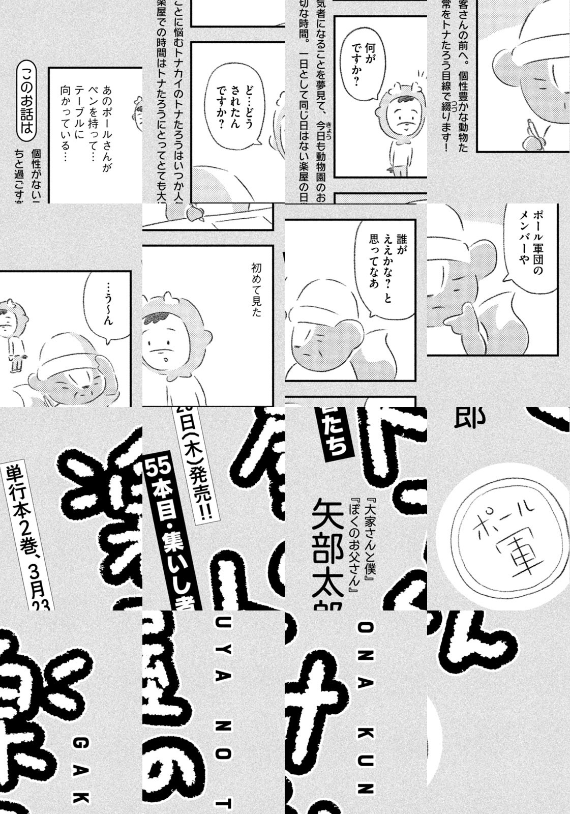 先輩にはいびられ、後輩には舐められ、お客さんには気づかれない主人公・トナカイのトナたろう、ちょっとガサツでデリカシーのないスカンクのポール先輩、元気すぎるお猿のアーコ、大人気のパンダくんなど、どこか見たことあるような動物たちの楽屋での悲喜こもごもなアニマル賛歌。自分の才能や“動物関係”に今日も悩みながら切磋琢磨する動物たちの舞台裏を覗いてみませんか?