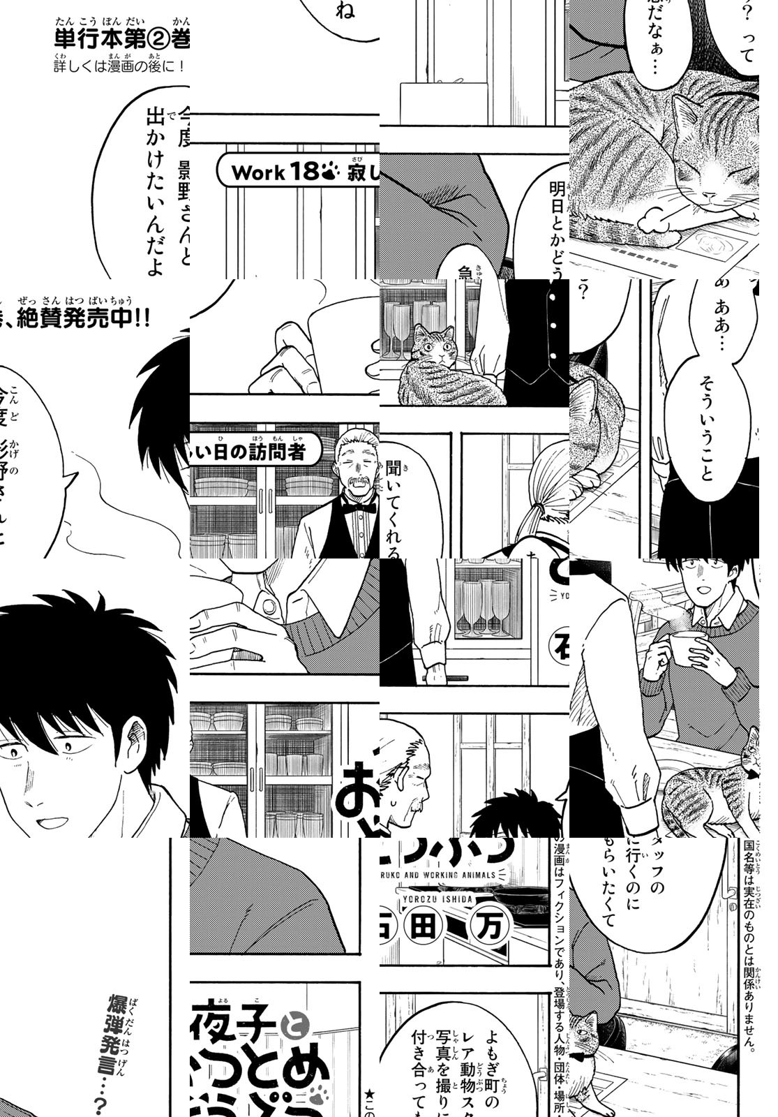 コミュニケーションが苦手なイラストレーター・影野夜子が住んでいる町は、いろんなお店でどうぶつが働く不思議な街で…。カフェラテづくりが得意な猫のウエイターさんをはじめ、パンダの保育士さん、カメのレジ打ち係さん、などなど。人が苦手な夜子でも、この町なら毎日が楽しい!どうぶつたちの可愛らしすぎるおつとめっぷりに笑いながら癒されるショートコメディ!!