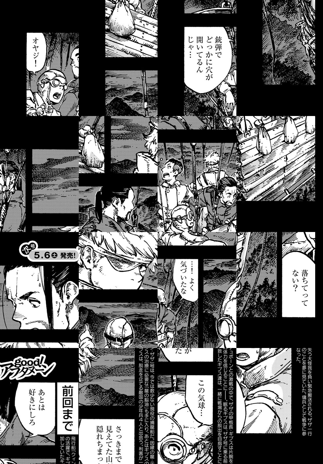 龍を追って、世界の空を往く捕龍船『クィン・ザザ号』。大物を捕まえれば一獲千金、獲りたての肉も食べ放題。でも、失敗したらもちろんお陀仏。空と龍に魅せられた乗組員たちの大冒険の旅&世界グルメ紀行!