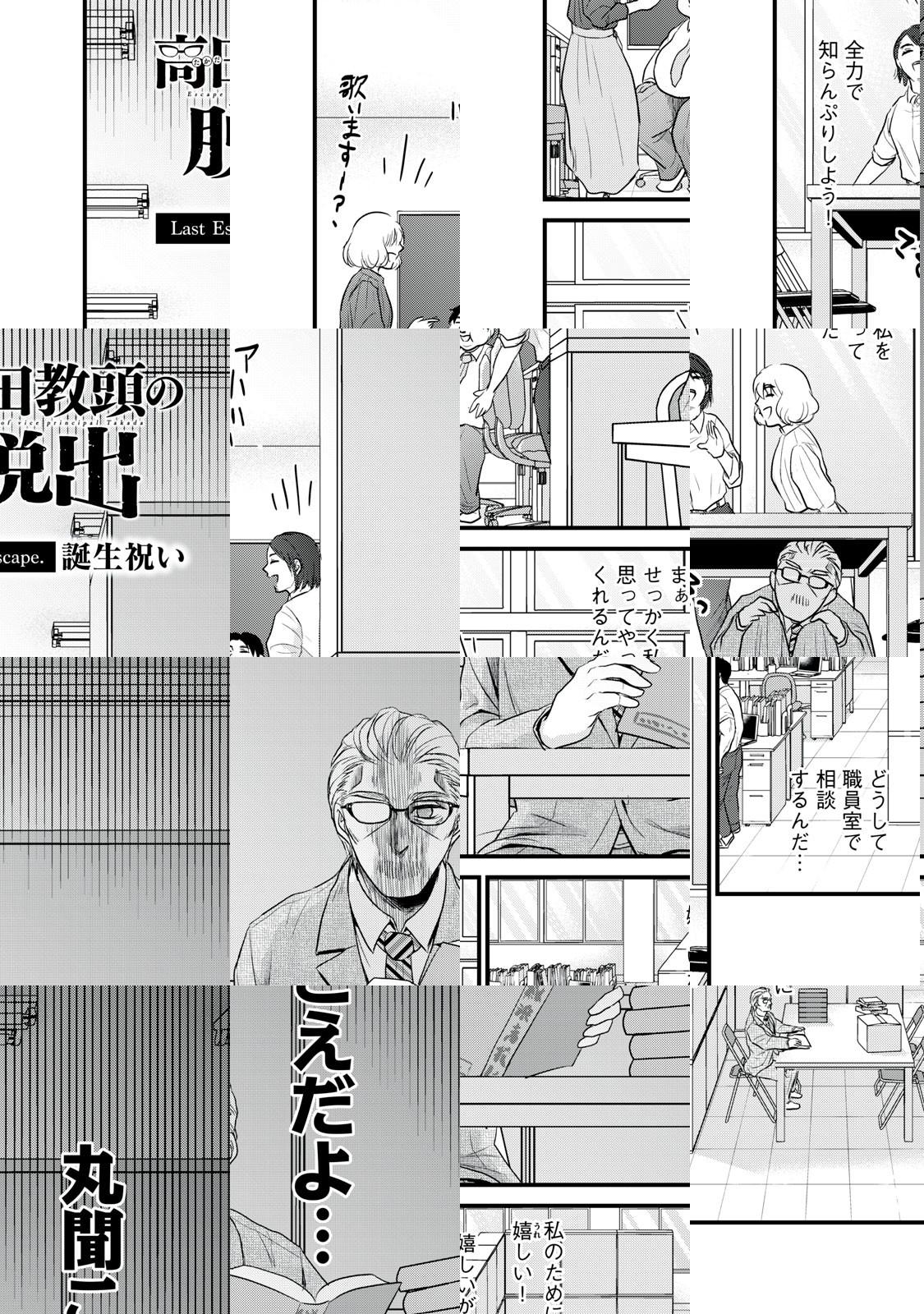 長い人生には、数えきれないくらいの窮地が訪れる。だからこそ、時には「逃げる」ことも大切だ…公立高校の教頭兼生活指導を務める高田一徹の日常も、中間管理職ならではのピンチの連続。真面目一徹な生き方に自負を持つ高田教頭は、自分なりのやり方でそこを切り抜けようとするが、ここから始まる「負の連鎖」が、職員室を盛り上げて、もとい騒がせてしまうことに…というようなギャグ漫画です!