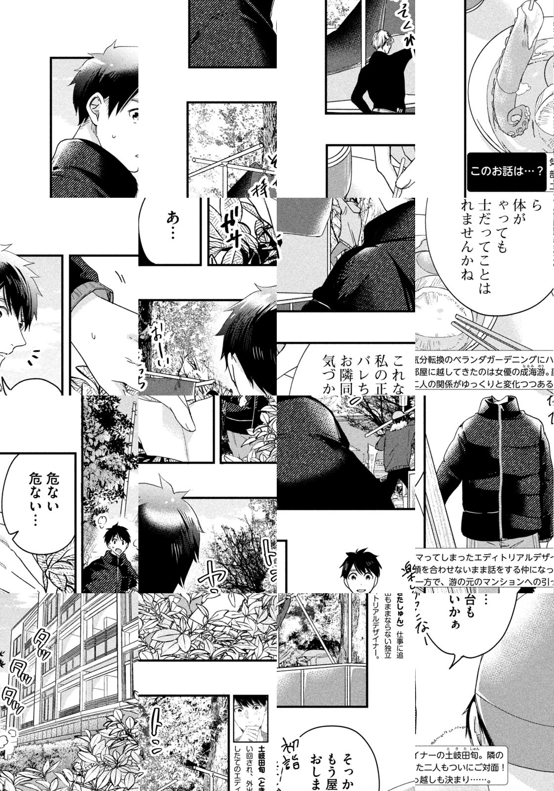 フリーのエディトリアルデザイナー・土岐田旬は、仕事に追われ部屋に籠りっぱなしの毎日。癒やしを求めてベランダガーデニングにハマるように。そんなある日、隣にちょっと変わった天然系の女性が引っ越してきた。ふとした出来事から、お互いの顔も知らぬままベランダの隔壁越しに話をするようになる二人。実は隣の女性は新進俳優・成海游なのだが……。ベランダとグリーンが繋ぐ隔壁越しの二人は?