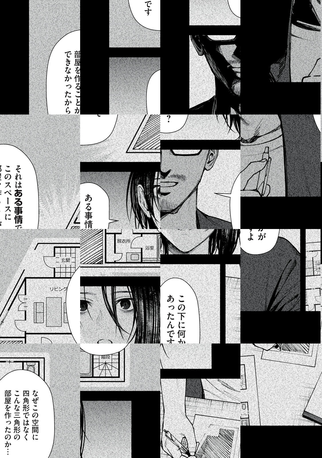 オカルト専門ライターの「私」の元にもたらされた、とある家の間取り図。一見ごく普通の一戸建て住宅だが、知人の設計士・栗原に意見を求めると、彼は「この家には変なところがある」と話し始めた……。この間取り図には、何かが隠されている…。話題の不動産ミステリー、待望のコミカライズ!!