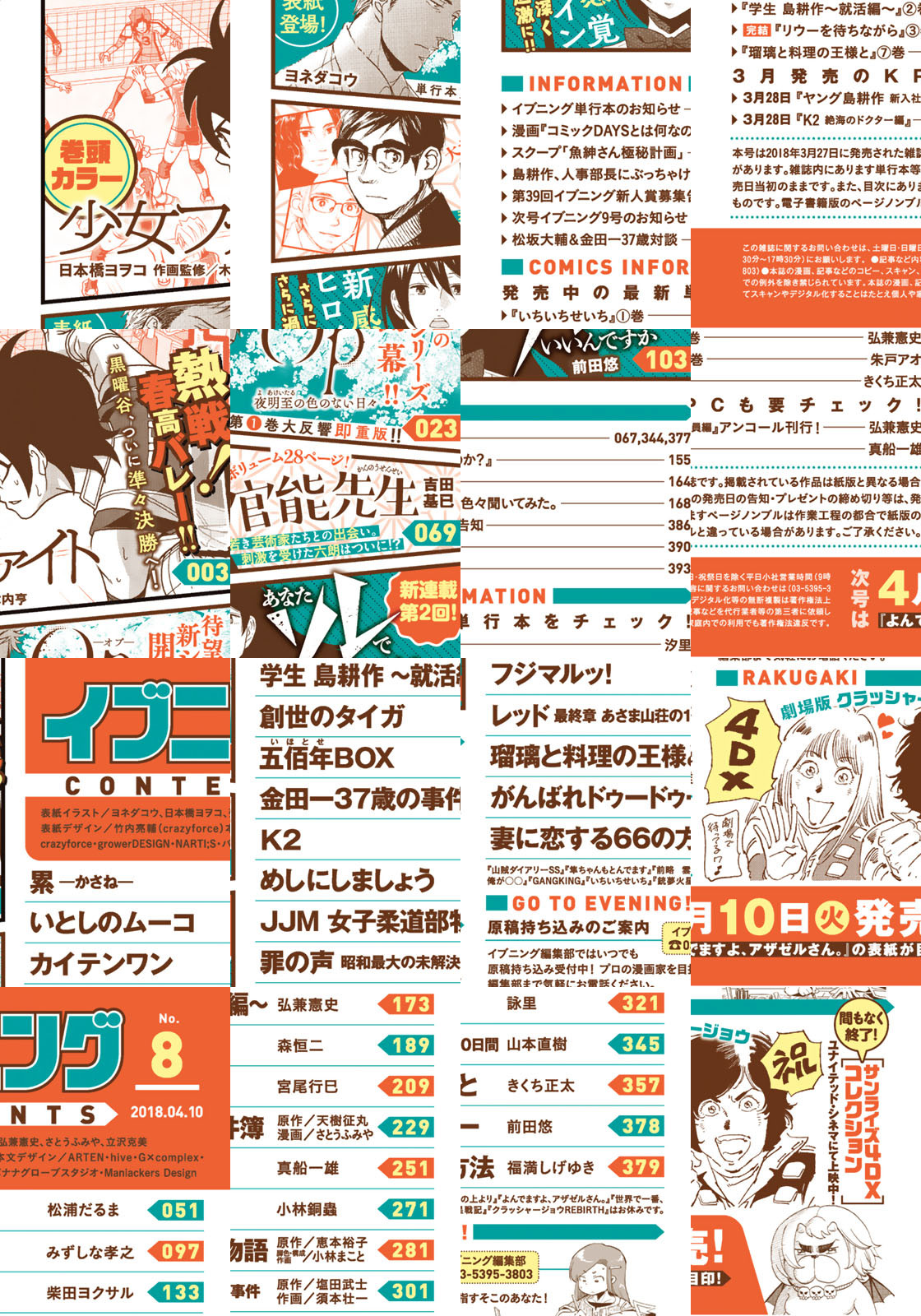 感動・驚き・興奮届けるイブニング8号!! ★★『Op -オプ- 夜明至の色のない日々』★★『少女ファイト』★★『累』★★『官能先生』★★『あなたソレでいいんですか』★★『創世のタイガ』★★『いとしのムーコ』★★『金田一37歳の事件簿』など話題作続々!