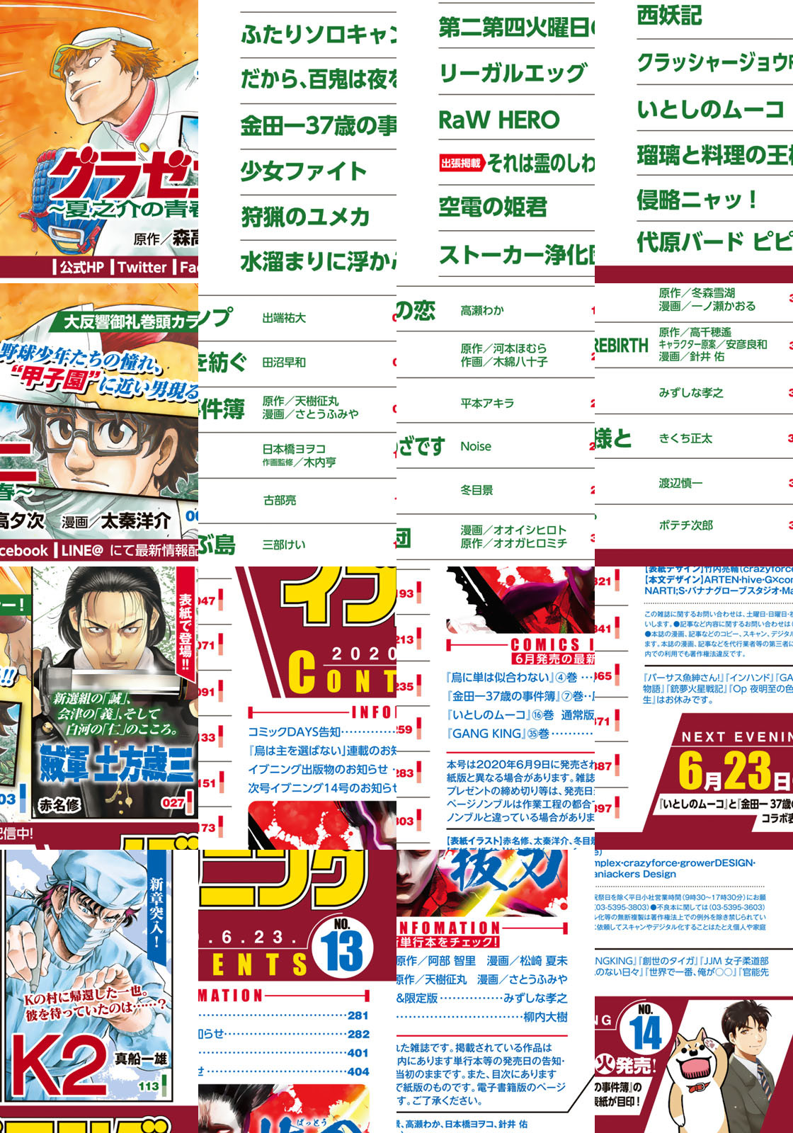 感動・驚き・興奮届けるイブニング13号!! ★★『グラゼニ ~夏之介の青春~』★★『ふたりソロキャンプ』★★『リーガルエッグ』★★『クラッシャージョウ REBIRTH』★★『第二第四火曜日の恋』★★『狩猟のユメカ』★★『金田一37歳の事件簿』★★『水溜まりに浮かぶ島』など話題作続々! 電子版限定連載『抜刀』★★リバイバル連載『累』『勇午 Final』『リウーを待ちながら』『いぬやしき』★★