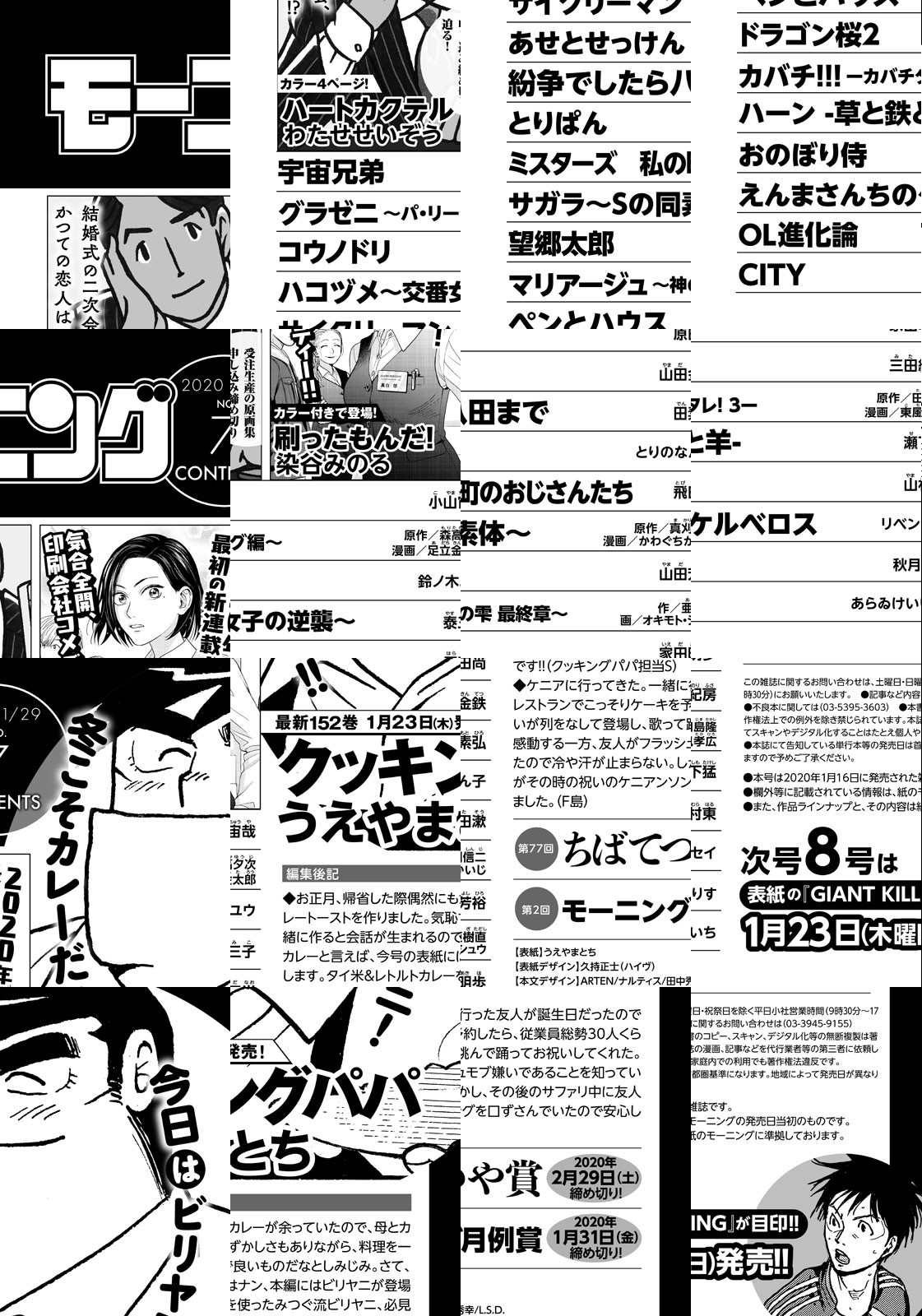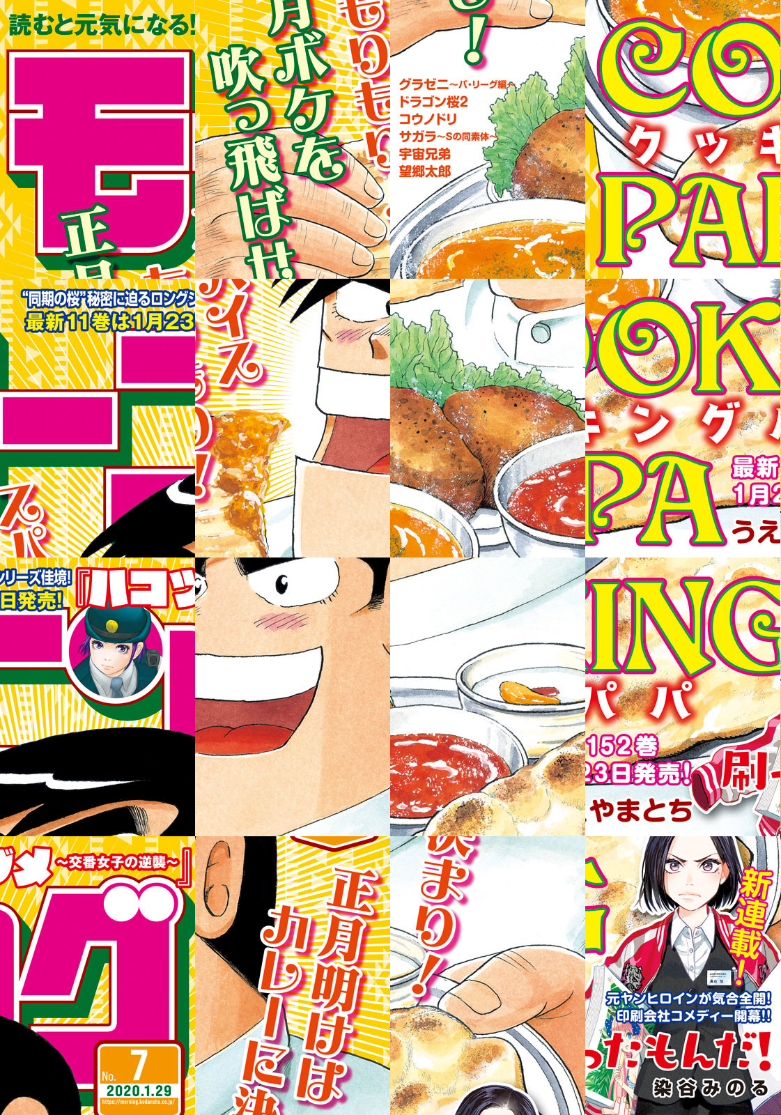 ◎『クッキングパパ』今日はビリヤニ! 冬こそカレーだ!! 最新152巻 1月23日(木)発売! ◎『刷ったもんだ』2020年最初の新連載! 気合全開、印刷会社コメディー!! カラー付きで登場! ◎︎『ハートカクテル』受注生産の原画集申し込み締め切り迫る! カラー4ページ! 結婚式の二次会、かつての恋人は!? ※作品ラインナップは、紙の「モーニング」に準拠しておりますが、一部、異なる場合があります。