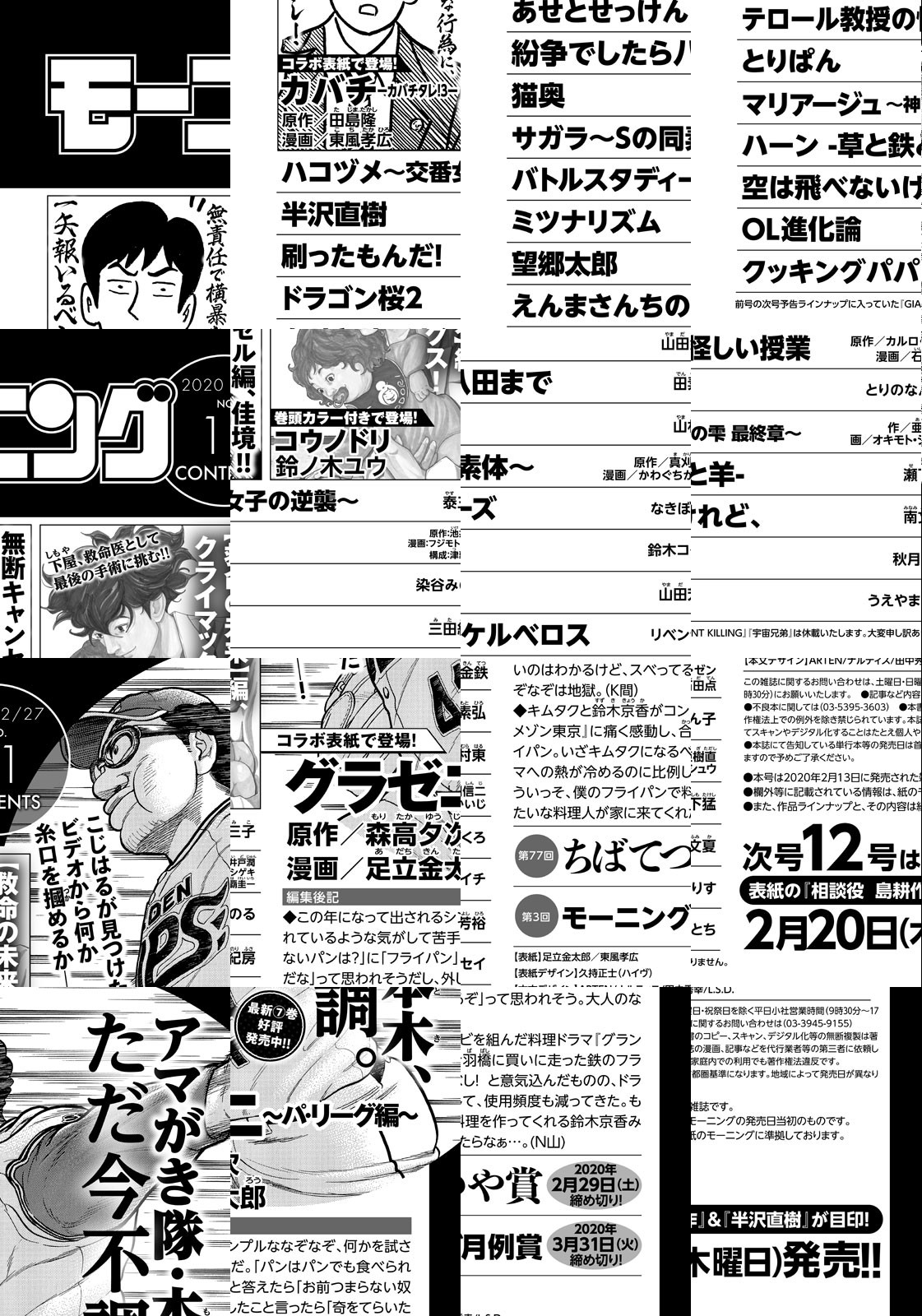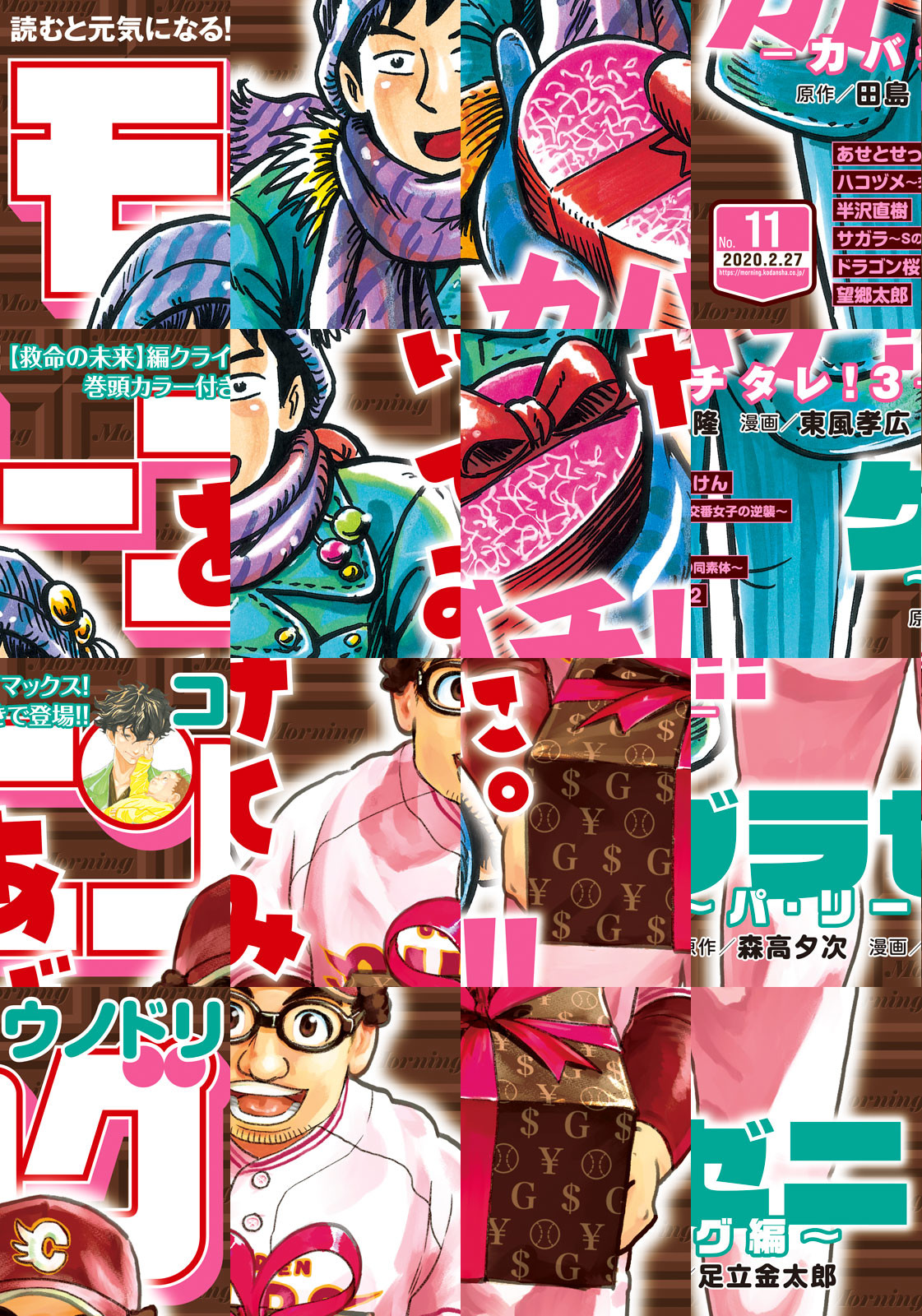 『グラゼニ~パ・リーグ編~』︎と『カバチ!!!-カバチタレ! 3-』のコラボ表紙! ◎『グラゼニ~パ・リーグ編~』アマがき隊・本木、ただ今不調。こじはるが見つけたビデオから何か糸口を摑めるか――! 最新7巻好評発売中!! ◎『コウノドリ』巻頭カラー付きで登場! 【救命の未来】編、クライマックス! 下屋、救命医として最後の手術に挑む!! ◎︎『カバチ!!!-カバチタレ! 3-』無断キャンセル編、佳境!! 無責任で横暴な行為に、一矢報いるべし! ◎『空は飛べないけれど、』第10回THE GATE大賞受賞作品! ※作品ラインナップは、紙の「モーニング」に準拠しておりますが、一部、異なる場合があります。