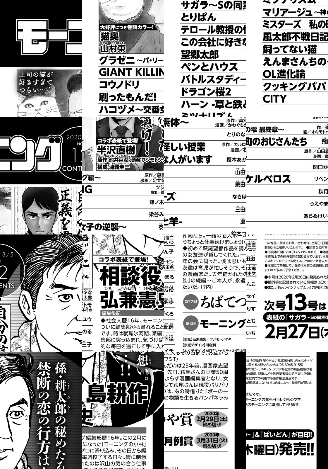 『相談役 島耕作』︎と『半沢直樹』のコラボ表紙! ◎『相談役 島耕作』 孫・耕太郎の秘めたる想い。禁断の恋の行方は…!! ◎『半沢直樹』自分の信じた正義を貫け! ◎『猫奥』大好評につき巻頭カラー! 上司の猫が好きすぎてつらい…! ※作品ラインナップは、紙の「モーニング」に準拠しておりますが、一部、異なる場合があります。