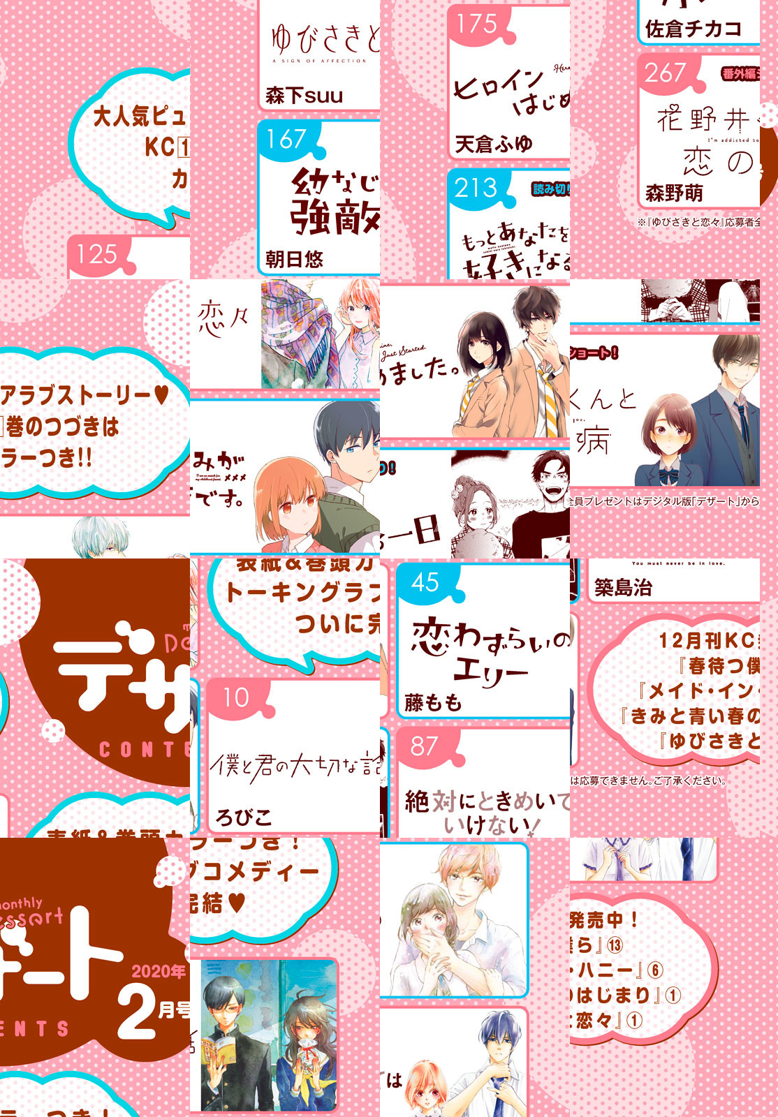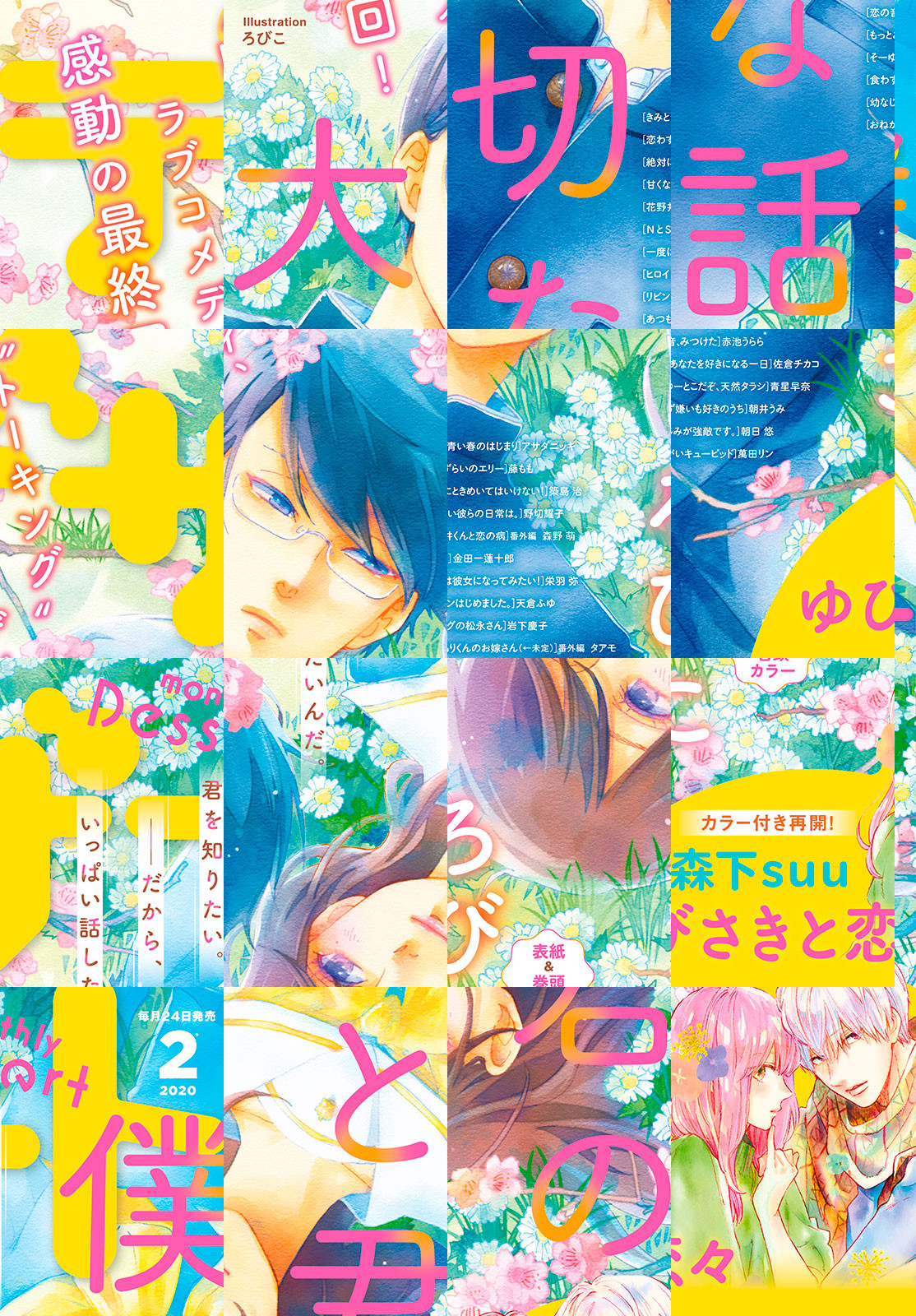 2019年令和最初の年納めは…豪華デザートで決まりっ! 大人気トーキングラブコメディ『僕と君の大切な話』が表紙&巻頭カラーで登場♪ ついに最終回…2人の恋の行方は!? さらにコミックス1巻も大反響『ゆびさきと恋々』がカラー付きで掲載。1巻の続きから読める&1巻と連動で“特製クリアファイル”がもらえる応募者全員プレゼントを実施しちゃいます(*^^*) ほかにも、ぼっちJK×イケメン人気者のジェットコースターラブコメ『きみと青い春のはじまり』がカラー付きで登場♪ 『一度は彼女になってみたい!』『甘くない彼らの日常は。』『恋の音、みつけた』など、2020年に要チェックなフレッシュ連載もいっぱいです☆彡 ※『ゆびさきと恋々』応募者全員プレゼントの応募券は、電子版には付属いたしません。ご了承ください。