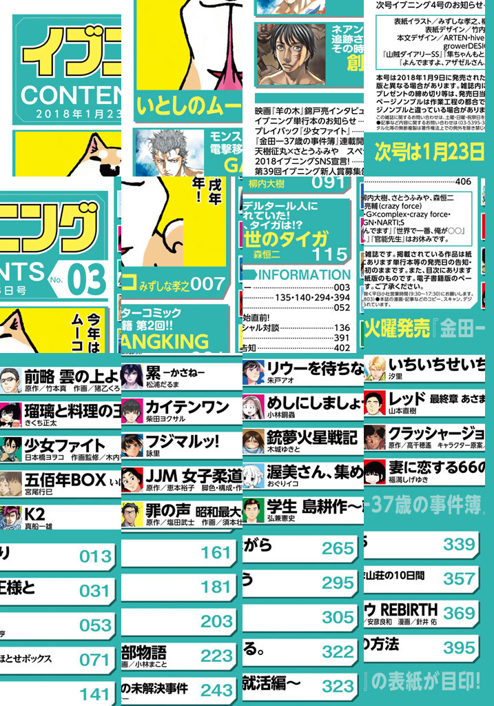 さあ戌年の幕開け! 表紙は『いとしのムーコ』! 巻頭カラーはイブニング連載『羊の木』映画化記念! 錦戸亮インタビュー! 巻中カラーで金田一“大人版”連載直前記念企画! 原作・天樹征丸×漫画・さとうふみやスペシャル対談! 待望の第2巻、1月23日発売! 話題騒然の人気連載『創世のタイガ』! モンスターコミック移籍連載第2回『ギャングキング』! ほかにも『クラッシャージョウ REBIRTH』『少女ファイト』『銃夢火星戦記』『学生 島耕作~就活編~』『いちいちせいち』など話題作続々! 【編:イブニング編集部/著:みずしな孝之/原作:竹本真/作画:猪乙くろ/著:きくち正太/著:日本橋ヨヲコ/作画監修:木内亨/著:宮尾行巳/著:柳内大樹/著:森恒二/著:真船一雄/著:松浦だるま/著:柴田ヨクサル/著 :詠里/原作:恵本裕子/脚色・構成・作画:小林まこと/原作:塩田武士/作画:須本壮一/著:朱戸アオ/著:小林銅蟲/著:木城ゆきと/著:おぐりイコ/著:弘兼憲史/著:汐里/著:山本直樹/原作:高千穂遥/キャラクター原案:安彦良和/著:針井佑/著:福満しげゆき】