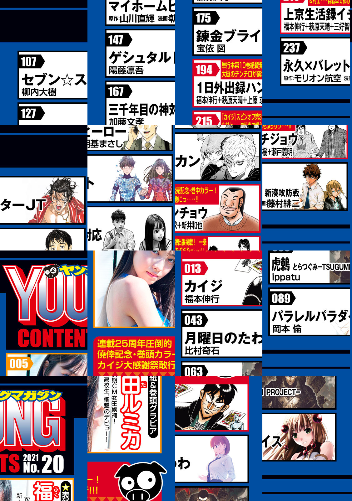 【巻頭カラー】『賭博堕天録カイジ24億脱出編』連載25周年記念、カイジ大感謝祭は悪魔的なSP企画盛りだくさん! 【巻中カラー】『1日外出録ハンチョウ』大槻のチンチロが窮地にっ‥‥! 【出張掲載】『上京生活録イチジョウ』「沼」編に登場した一条のフリーター時代を描く、『カイジ』スピンオフ第3弾出張掲載‥‥! 【表紙&巻頭グラビア】大抜擢の15歳、福田ルミカが衝撃デビュー! 【巻末グラビア】透明感抜群、斎藤さららが、漫画誌初登場・初水着!