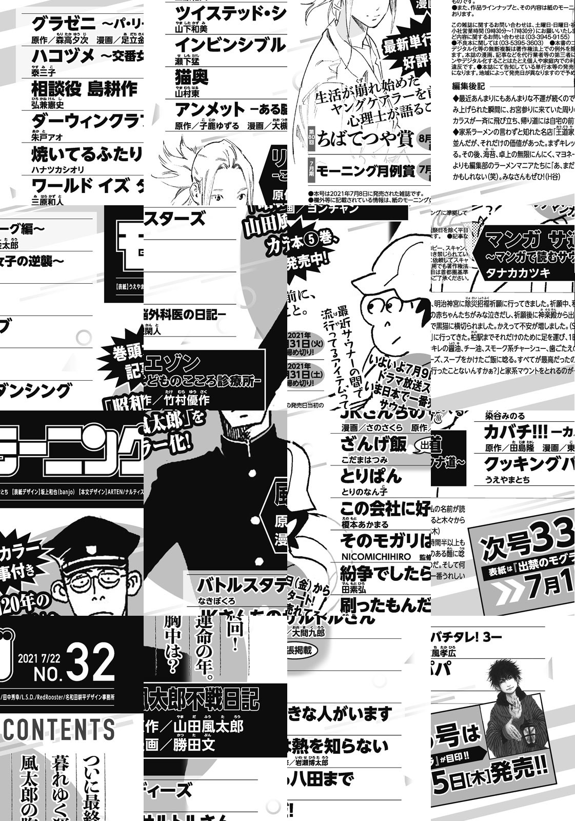 ◎『風太郎不戦日記』巻頭カラー記事付き。「昭和20年の山田風太郎」をカラー化! ついに最終回! 暮れゆく運命の年。風太郎の胸中は? ◎『マンガ サ道~マンガで読むサウナ道~』いよいよ7月9日(金)からドラマ放送スタート! いま日本で一番売れてるサウナマンガ! 最近サウナーの間で流行ってるアイテムって? ◎『リエゾン-こどものこころ診療所-』最新単行本第5巻、好評発売中! 生活が崩れ始めたヤングケアラーを前に、心理士が語ること。 ※作品ラインナップは、紙の「モーニング」に準拠しておりますが、一部、異なる場合があります。