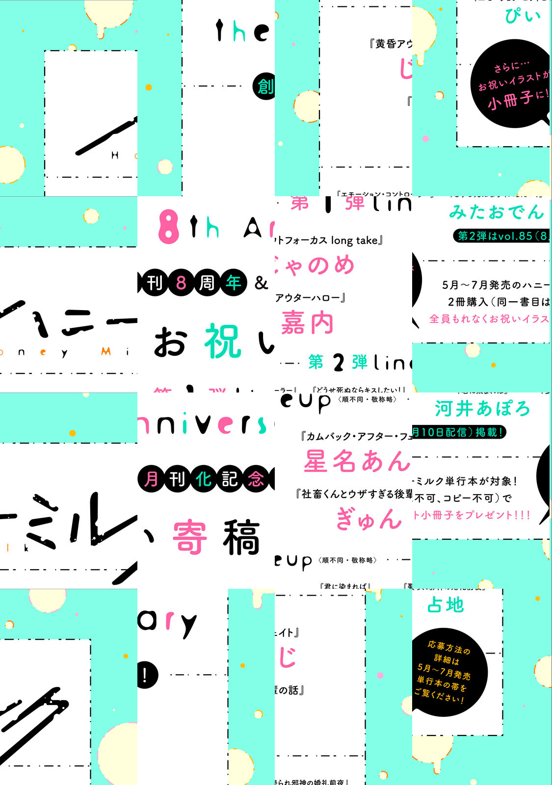 ★ハニーミルク創刊8周年&月刊化記念!! じゃのめさん、星名あんじさん、嘉内さん、ぎゅんさんのお祝い寄稿!!! 「黄昏アウトフォーカス」アニメもついにスタート!!最新情報をお見逃しなく!!! 新連載4作品に加え、「エモーション・コントローラー」番外編も!!! ★新連載 バンドマン×売り専ボーイの淡い恋 「夜明け前にきみを呼ぶ」嘉内 人間不信の元バスケ選手×美しい同級生の学園青春ラブ! 「嵐とスノードロップ」天ノ川子 共演者といきなり同棲!? 俳優同士のきらめくゼロ距離ラブ! 「甘えたがりのスターダスト」菖エリカ キスからはじまる幼なじみ同士のピュアきゅんラブ! 「僕らがキスをする理由」波藻 <vol.84 掲載ラインナップ> 「残像スローモーション」第8話(前編) じゃのめ 【番外編!】「エモーション・コントーラー」ぴい 「イケオジモンスターと絶対零度男子」第18話(前編) フミト 「猫になりたい田万川くん」第22話 灯乃モト 「どうせ死ぬならキスしたい!」第6話 みたおでん 「君に染まれば」第12話 河井あぽろ 「マイ・クレイジー・ボーイフレンド」第5話 さとう 「俺が好きって言ったらどうする?」第3話 くもそく 「古BLの受けは令和でモブとして暮らしたいのに」第6話 青色イリコ 「社畜くんとウザすぎる後輩の話」第10話 ぎゅん 【豪華2本立て!】「たまらないのは恋なのか」第6話&第7話 空華みあ 【豪華3本立て!】「かわいいきみに、ねだらせたい。」第6話&第7話&第8話 梅缶もこ 【新連載!】「夜明け前にきみを呼ぶ」第1話 嘉内 【新連載!】「嵐とスノードロップ」第1話 天ノ川子 【新連載!】「甘えたがりのスターダスト」第1話 菖エリカ 【新連載!】「僕らがキスをする理由」第1話 波藻 【全699ページ】 ★★ハニーミルクは毎月10日配信★★