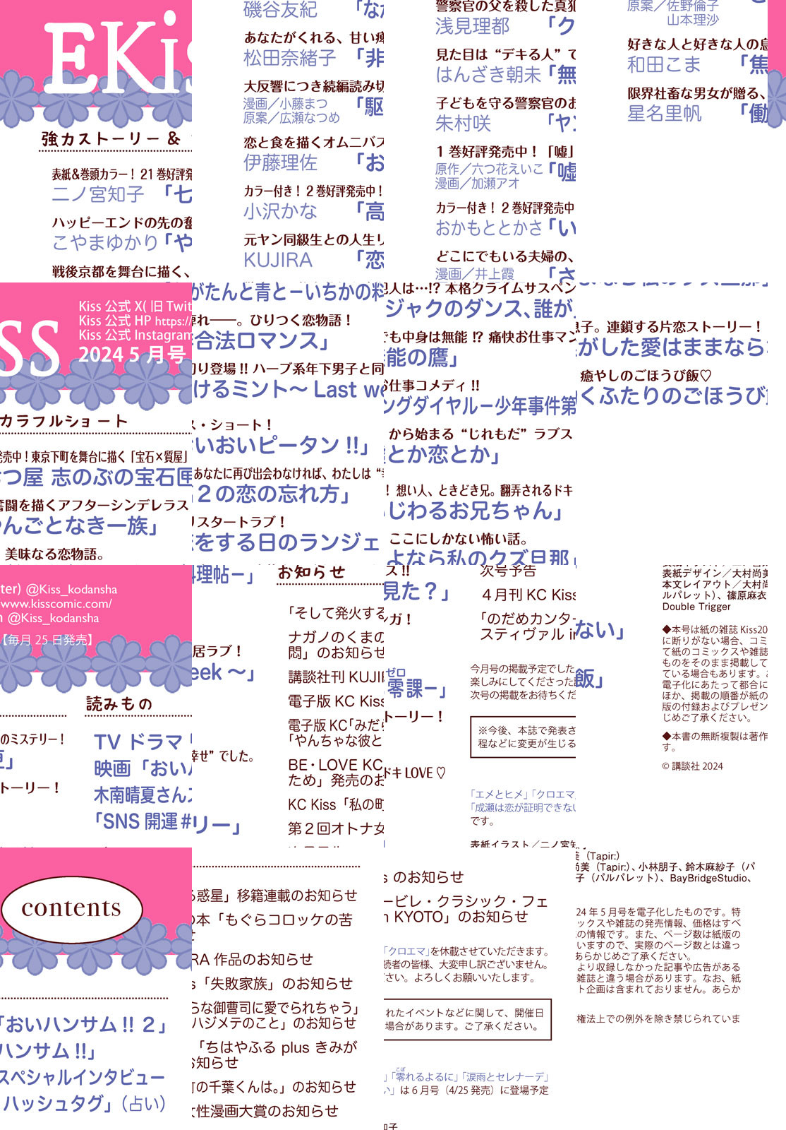 大人気作『七つ屋 志のぶの宝石匣』(二ノ宮知子)が表紙&巻頭カラーで登場!! 西のライバルも登場で、恋もミステリーもますます盛り上がる大阪編から目が離せません!!! TVドラマ続編&映画化決定の『おいハンサム!!』から木南晴夏さんのスペシャルインタビューも! コミックス最新刊も好評発売中の『高2の恋の忘れ方』(小沢かな)、『いじわるお兄ちゃん』(おかもととかさ)はカラー付きで登場! 絡まり合う想いはさらに切なさを増していきーーー!? 昨年10月号に登場した読み切り『駆けるミント』(漫画/小藤まつ、原案/広瀬なつめ)が大好評につき、 続編読み切り『駆けるミント~Last week~』として再登場! 芽吹いたばかりの小さな恋の行方を見守って! 強力連載陣、『やんごとなき一族』(こやまゆかり)、『ながたんと青と-いちかの料理帖-』(磯谷友紀)、『クジャクのダンス、誰が見た?』(浅見理都)、『無能の鷹』(はんざき朝未)、『非合法ロマンス』(松田奈緒子)など、見逃せない人気作も一挙掲載です。 話題沸騰中のKiss5月号をお楽しみに♪ 【*「Kiss」の電子版「EKiss」には付録、プレゼントページは付きません。ご了承ください】