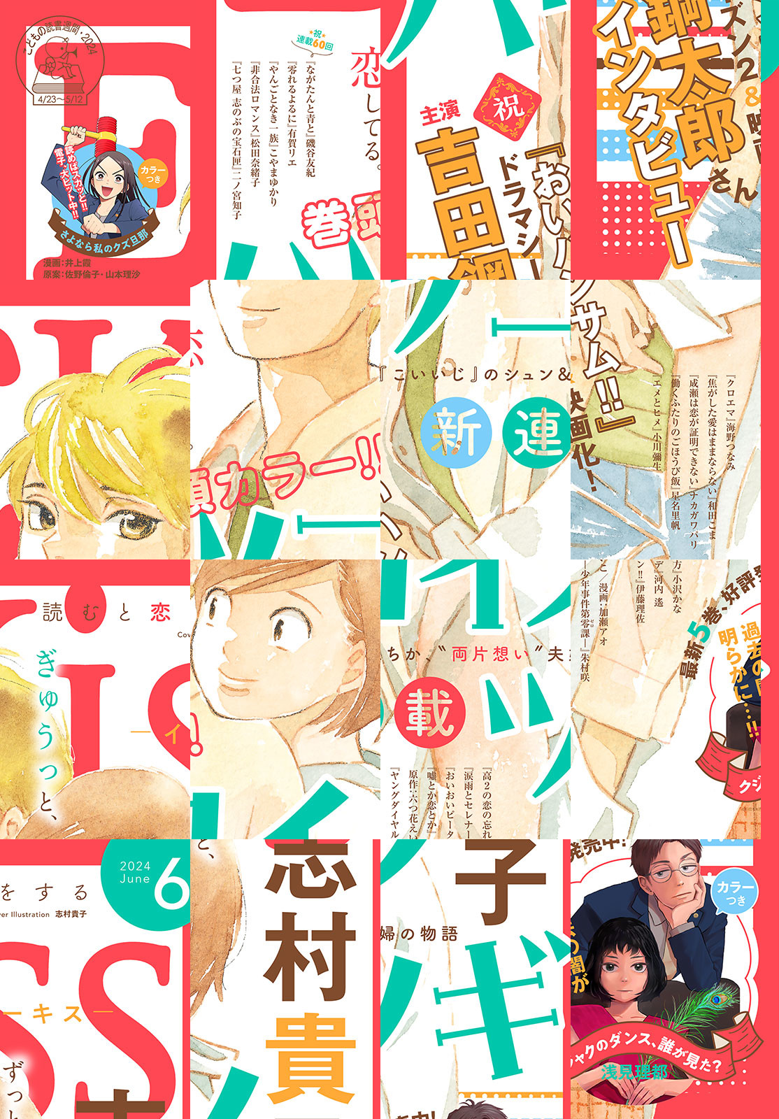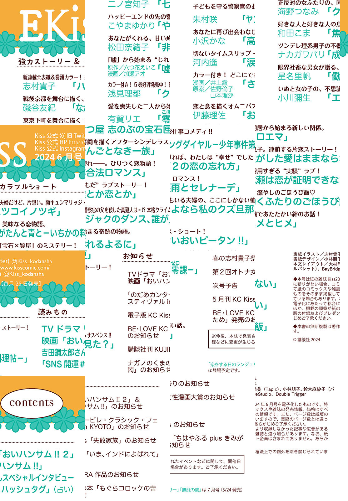 志村貴子待望の新連載『ハツコイノツギ』が表紙&巻頭カラーで登場!! 夫婦だけど片想いーーー。切ない胸キュンストーリーの開幕です!!! TVドラマ続編が絶好調!映画公開も待ち遠しい『おいハンサム!!』から、吉田鋼太郎さんのスペシャルインタビューも! コミックス最新刊も好評発売中の『クジャクのダンス、誰が見た?』(浅見理都)、 電子コミックが大人気の『さよなら私のクズ旦那』(漫画/井上霞、原案/佐野倫子 山本理沙)はカラー付きで登場! 緊張感高まる展開から目が離せません!! 強力連載陣、『やんごとなき一族』(こやまゆかり)、『ながたんと青と-いちかの料理帖-』(磯谷友紀)、『涙雨とセレナーデ』(河内遙)、『クロエマ』(海野つなみ)、『非合法ロマンス』(松田奈緒子)など、見逃せない人気作も一挙掲載です。 話題沸騰中のKiss6月号をお楽しみに♪ 【*「Kiss」の電子版「EKiss」には付録、プレゼントページは付きません。ご了承ください】