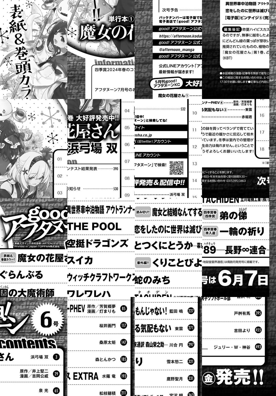 good!アフタヌーン2024年6号は魔女がいっぱい! 表紙&巻頭カラーは待望の単行本1巻が発売された『魔女の花屋さん』(浜弓場双)。“花の魔女”ヨシノと見習いアリーの前に謎の少女が現れた! 美しすぎるカラーページをお見逃しなく! 特別読み切りは『魔女と結婚なんてするもんじゃない!』(藍田 鳴)。魔女との楽しい結婚生活を送っていた主人公は、思いがけない出来事に遭遇する! good!アフタヌーンで魔女といえば『ウィッチクラフトワークスEXTRA』(水薙竜)。火々里さんの一日を追います。 選考委員・沙村広明氏激賞! 2023年秋の四季賞受賞作『弟の俤』(戸枡有馬)、準入選『一輪の祈り』(吉田より)を掲載! *電子配信版は通信環境によりダウンロードに時間がかかる場合がございます。