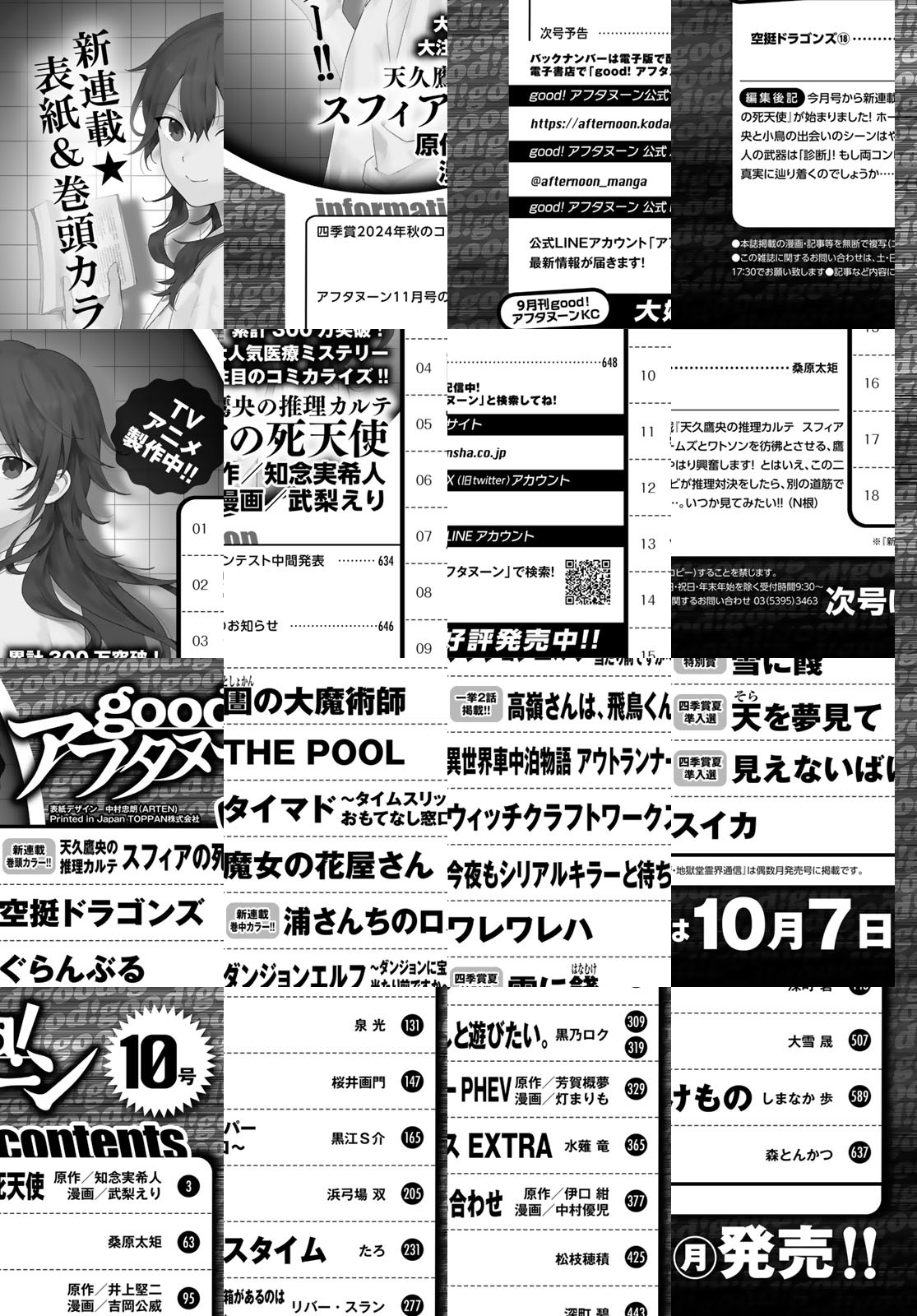 W新連載始動! good!アフタヌーン2024年10号の表紙&巻頭カラーは、新連載『天久鷹央の推理カルテ スフィアの死天使』(知念実希人 武梨えり)。TVアニメ化決定、累計300万部突破の大人気医療ミステリーを『かんなぎ』の武梨えり氏がコミカライズ! もう一つの新連載は『浦さんちのロスタイム』(たろ)。偏屈じじいと不器用孫による新しい家族の始まりを四季賞出身の新鋭が描く! 2024年夏特別賞受賞作『雪に餞』(深町碧)、準入選『天を夢見て』(大雪晟)、準入選『見えないばけもの』(しまなか歩)の3本を掲載! *電子配信版は通信環境によりダウンロードに時間がかかる場合がございます。